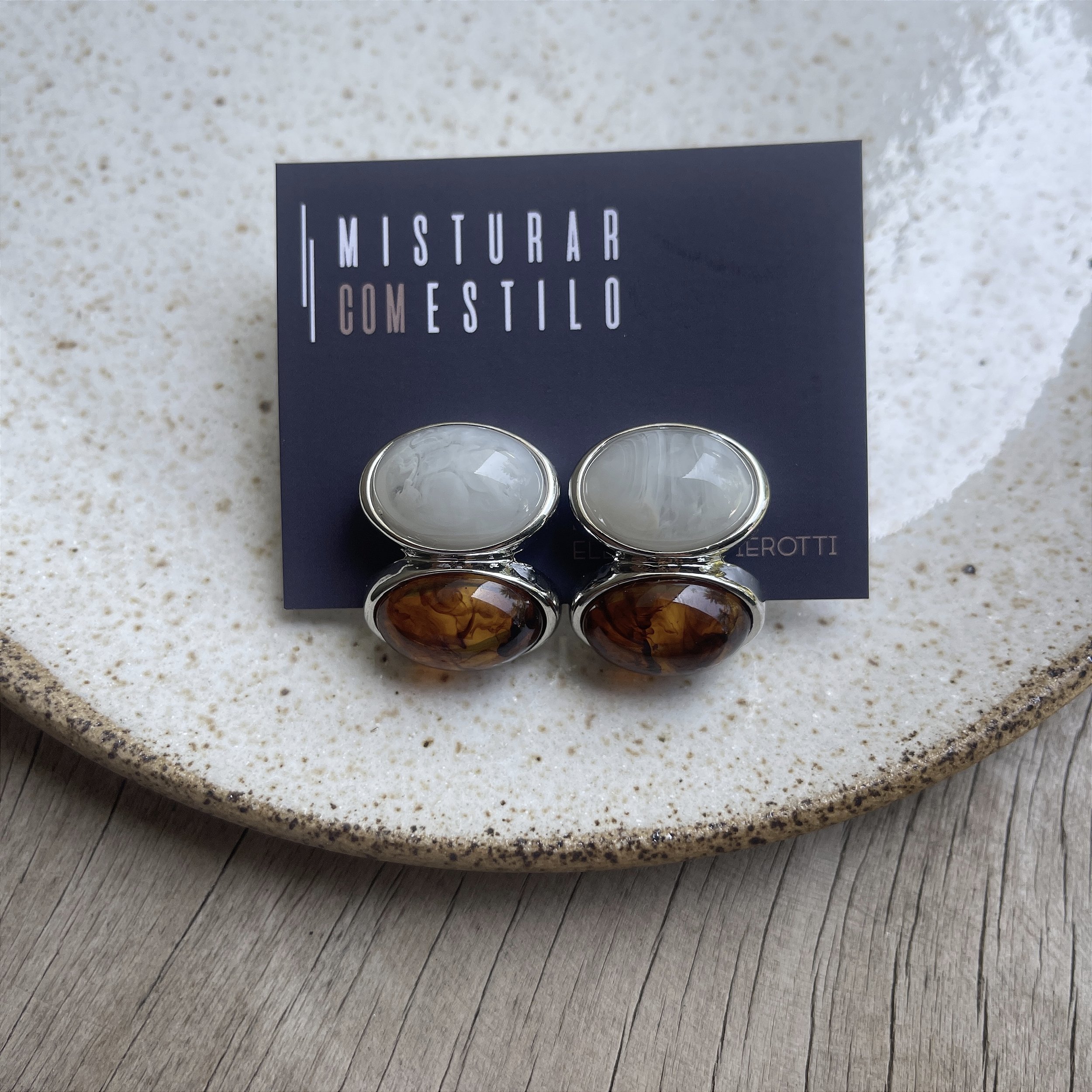 brinco com duas pedras ovais marfim e tartaruga, ródio - biju