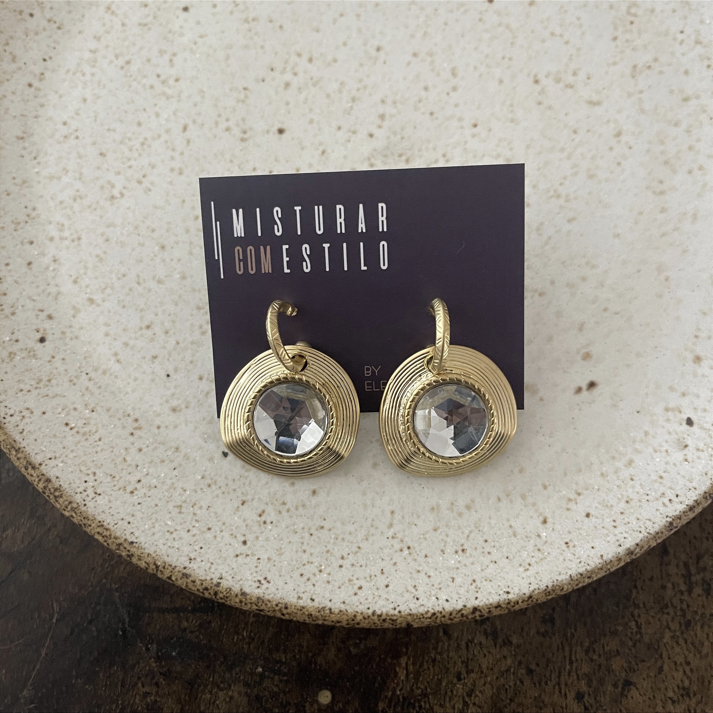 Brinco redondo com uma pedra cristal e pino argolinha, dourado fosco- biju