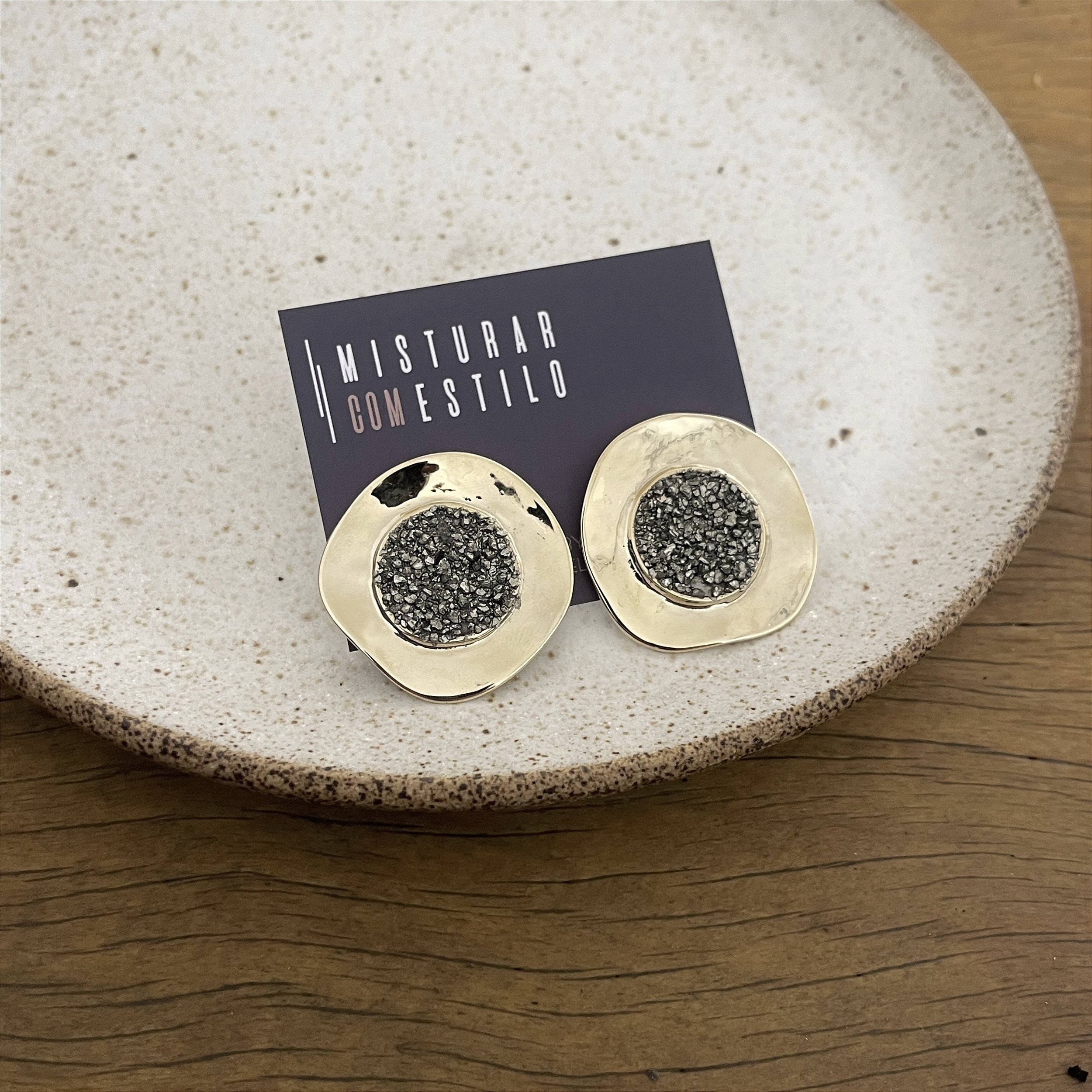brinco redondo com pedrinhas de pirita, dourado - semijoia