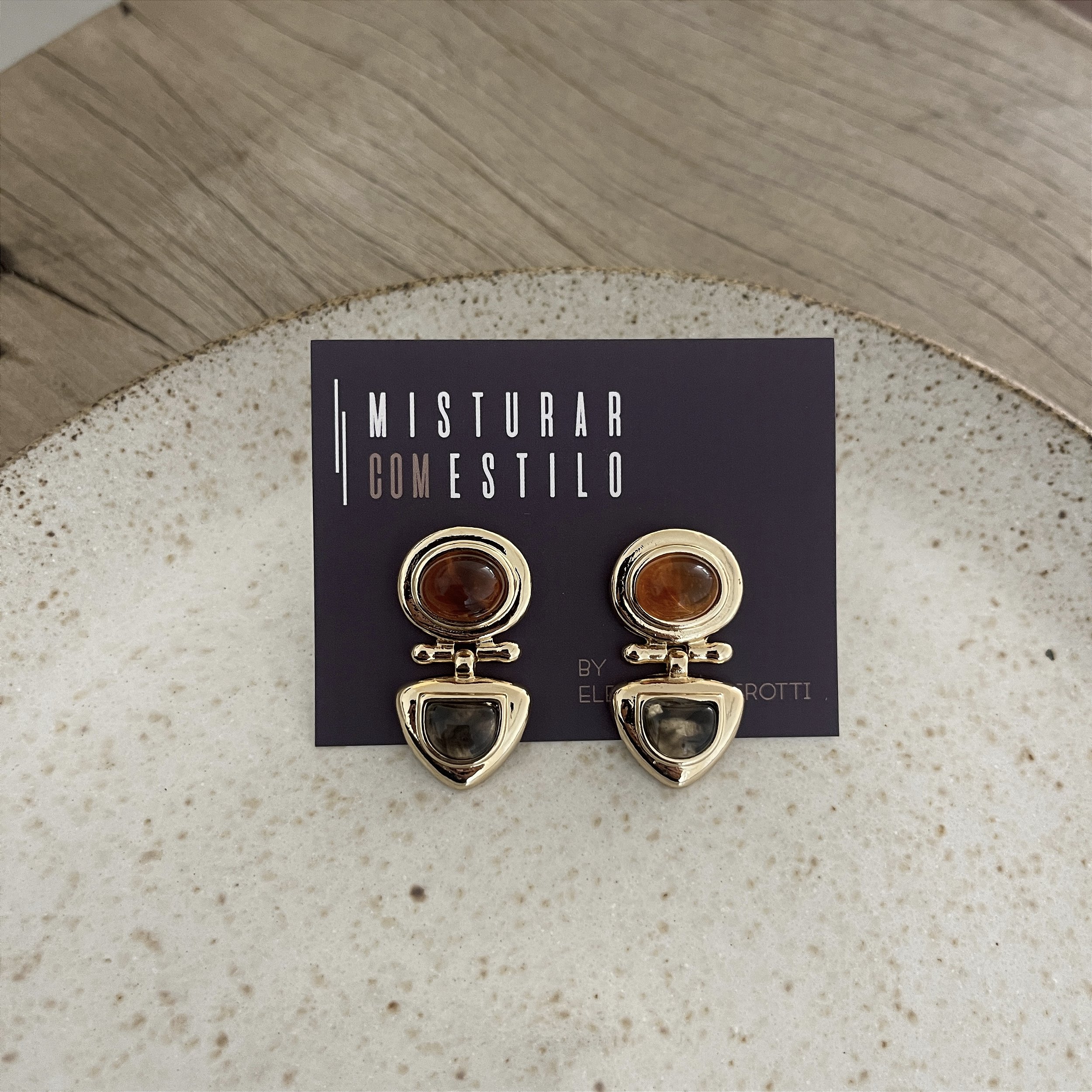 brinco oval âmbar com triângulo fumê, dourado - biju