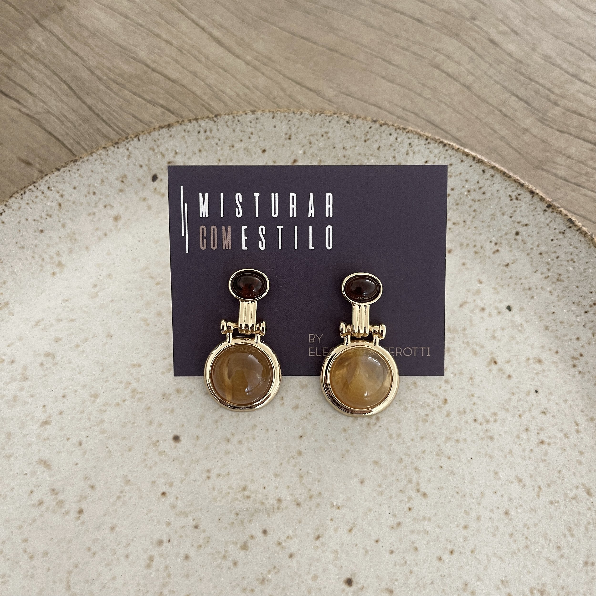 brinco oval tartaruga com pedra redonda âmbar , dourado - biju