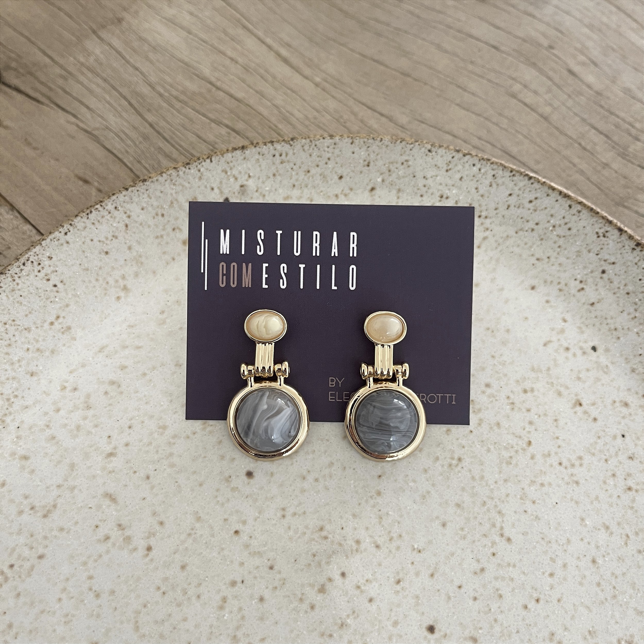 brinco oval marfim com pedra redonda cinza , dourado - biju