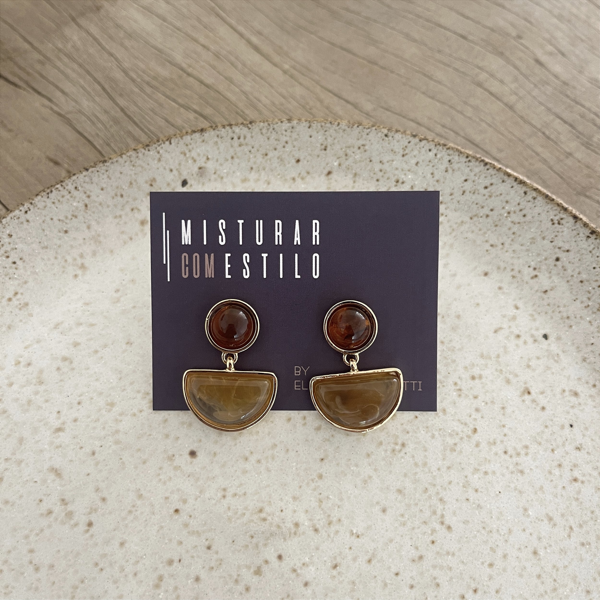 brinco redondo tartaruga com pedra meia lua âmbar , dourado - biju