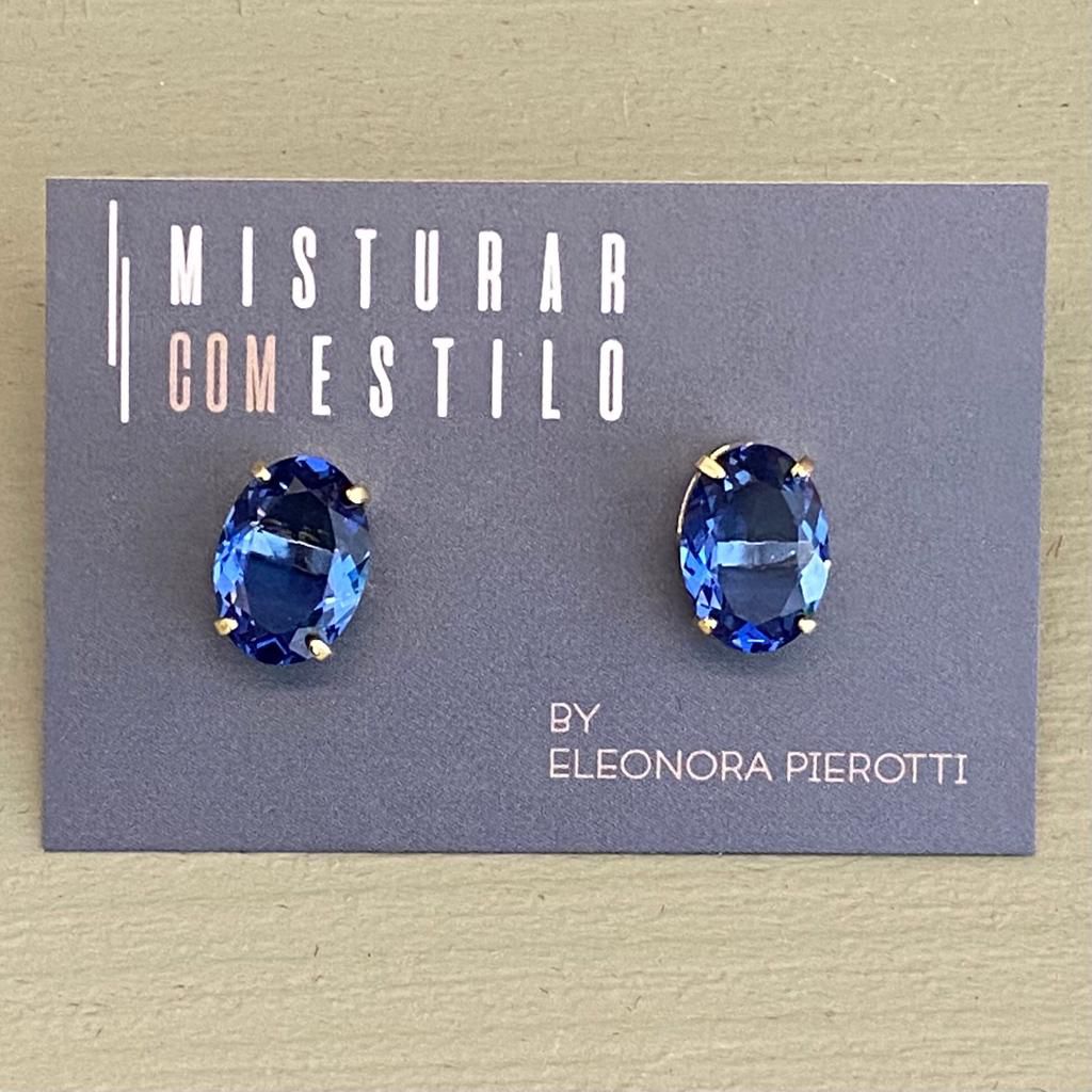Brinco Oval com pedra Safira, acabamento em dourado - Semijoia