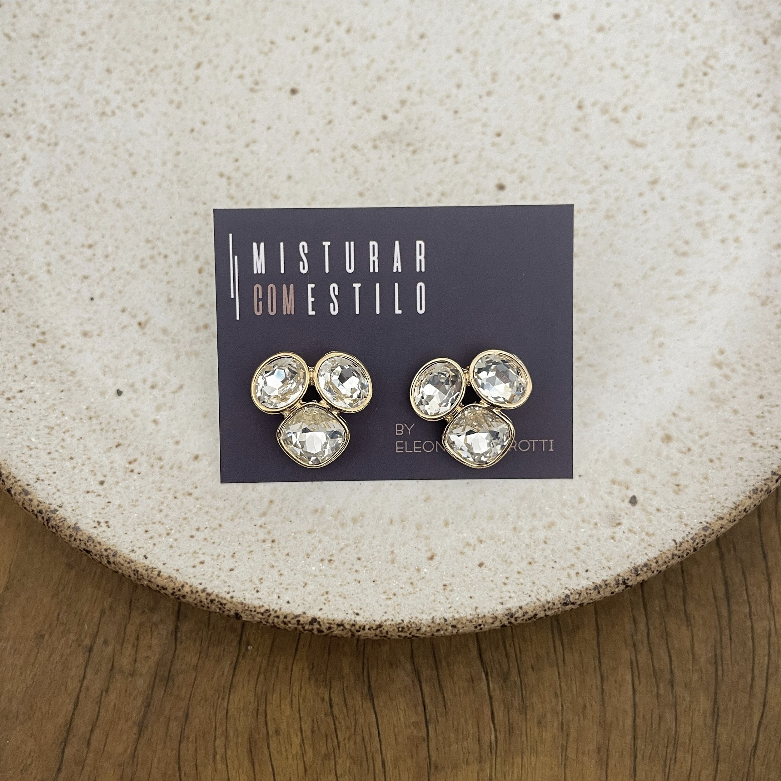 brinco com três cristais, dois ovais e um quadrado, dourado - biju, latão