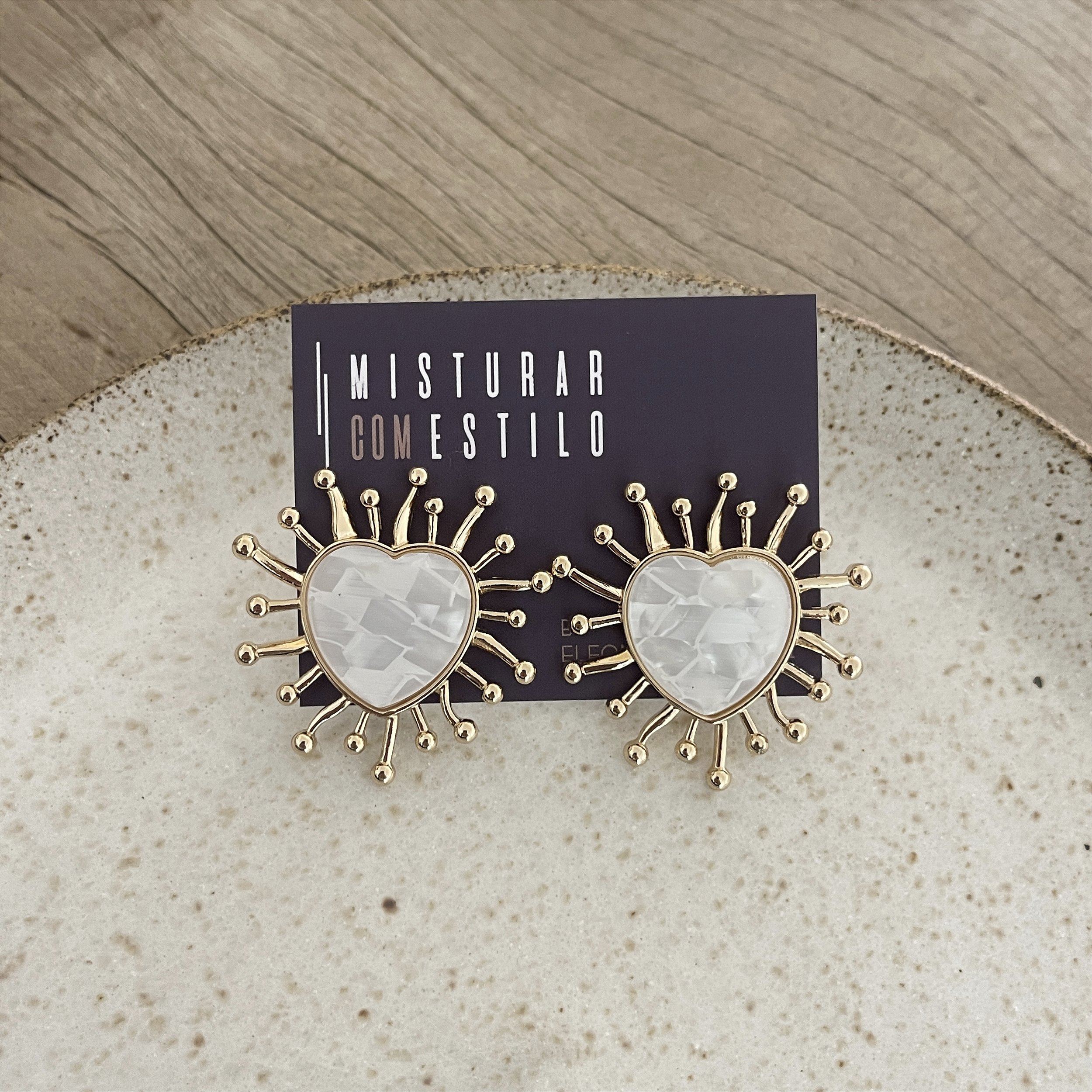 brinco coração madrepérola com esferas espalhadas, dourado - biju