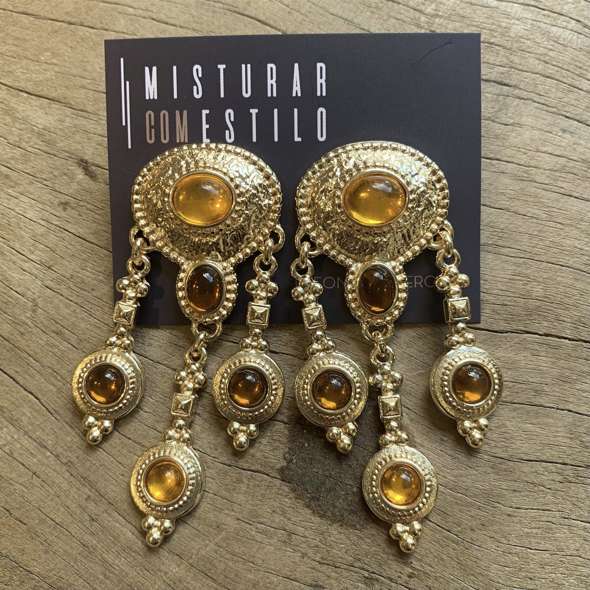 brinco com varios formatos e pedras diferentes, na cor âmbar, dourado - bijuteria