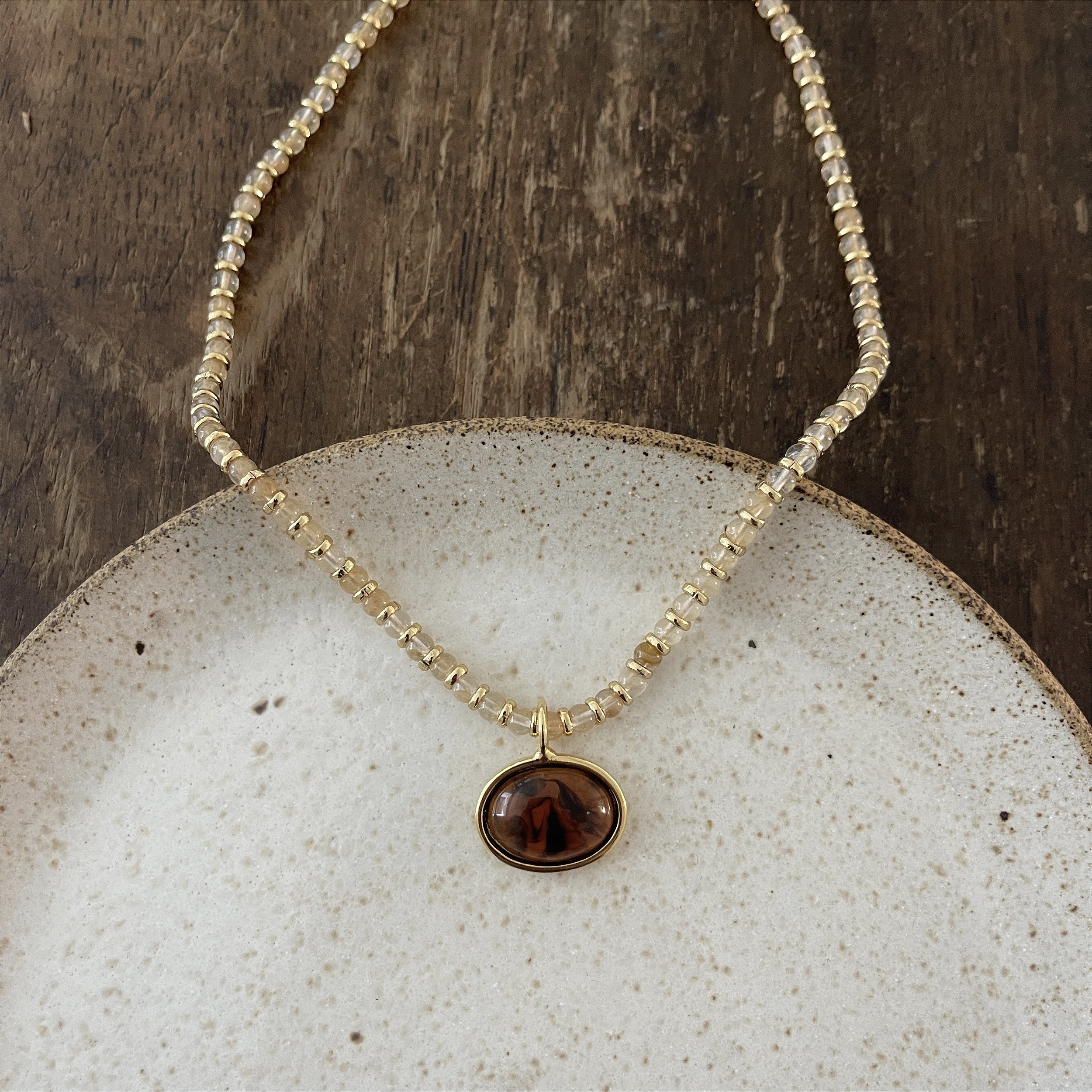 Colar de pedras naturais rutilado com pingente de pedra tartaruga , curto , bijuteria.