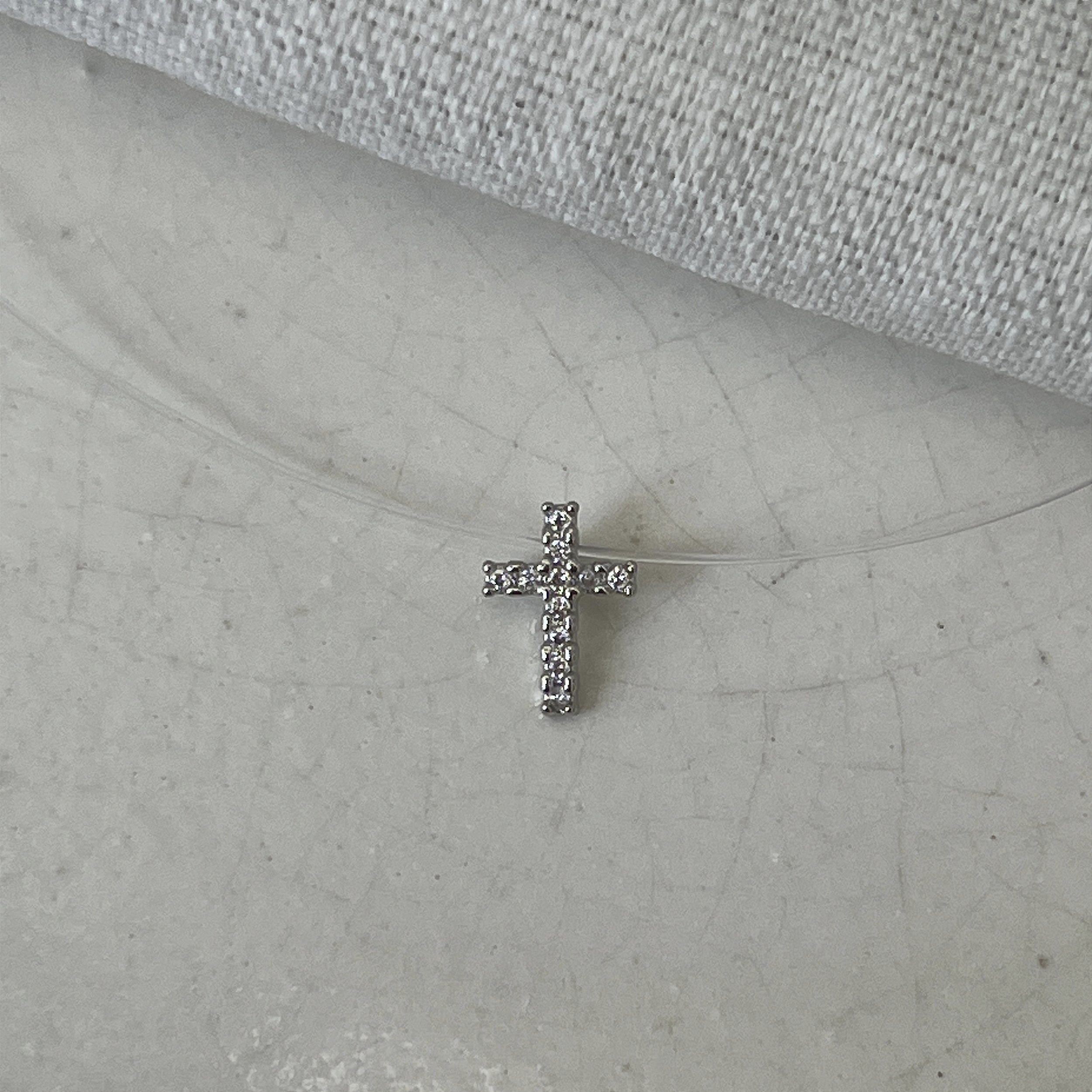 Colar choker em fio de nylon com um mini pigente de Cruz cravejada de Zircônia - Ródio - semijoia