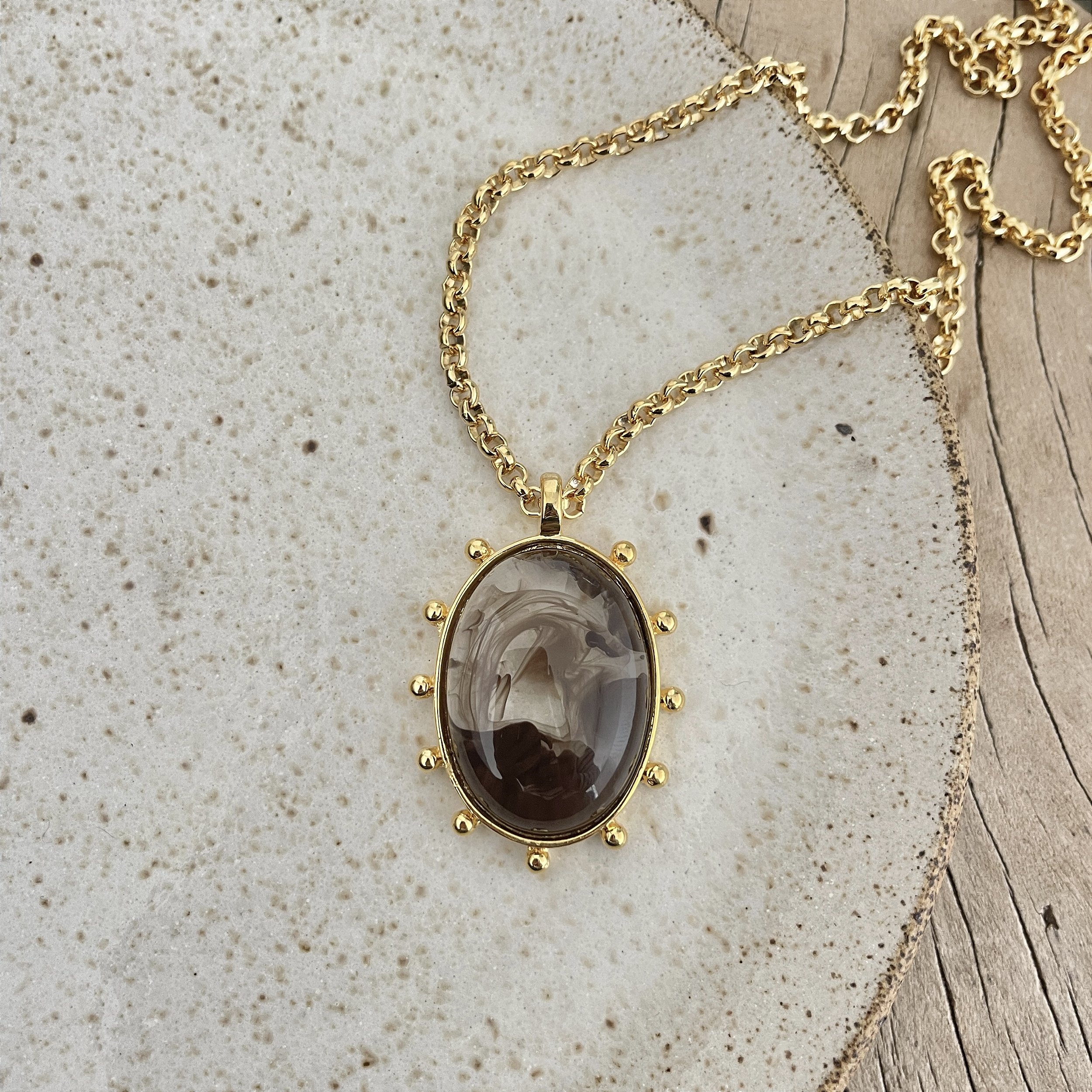Colar corrente de elos portugueses, com pingente oval e esferas por fora, dourado - biju