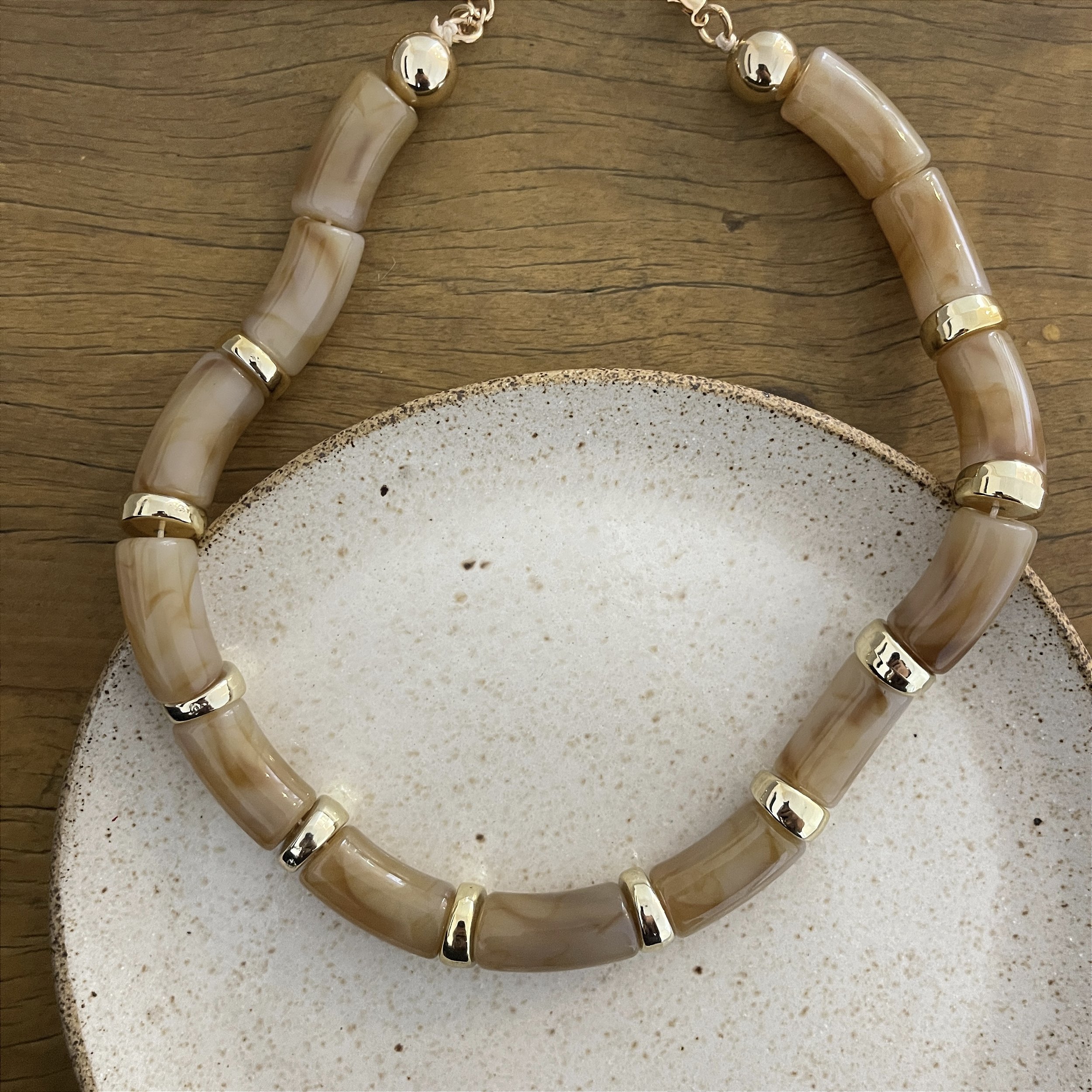 colar com peças de resina que lembra cilindro, e entremeios grossos dourados, cor âmbar mescla, biju