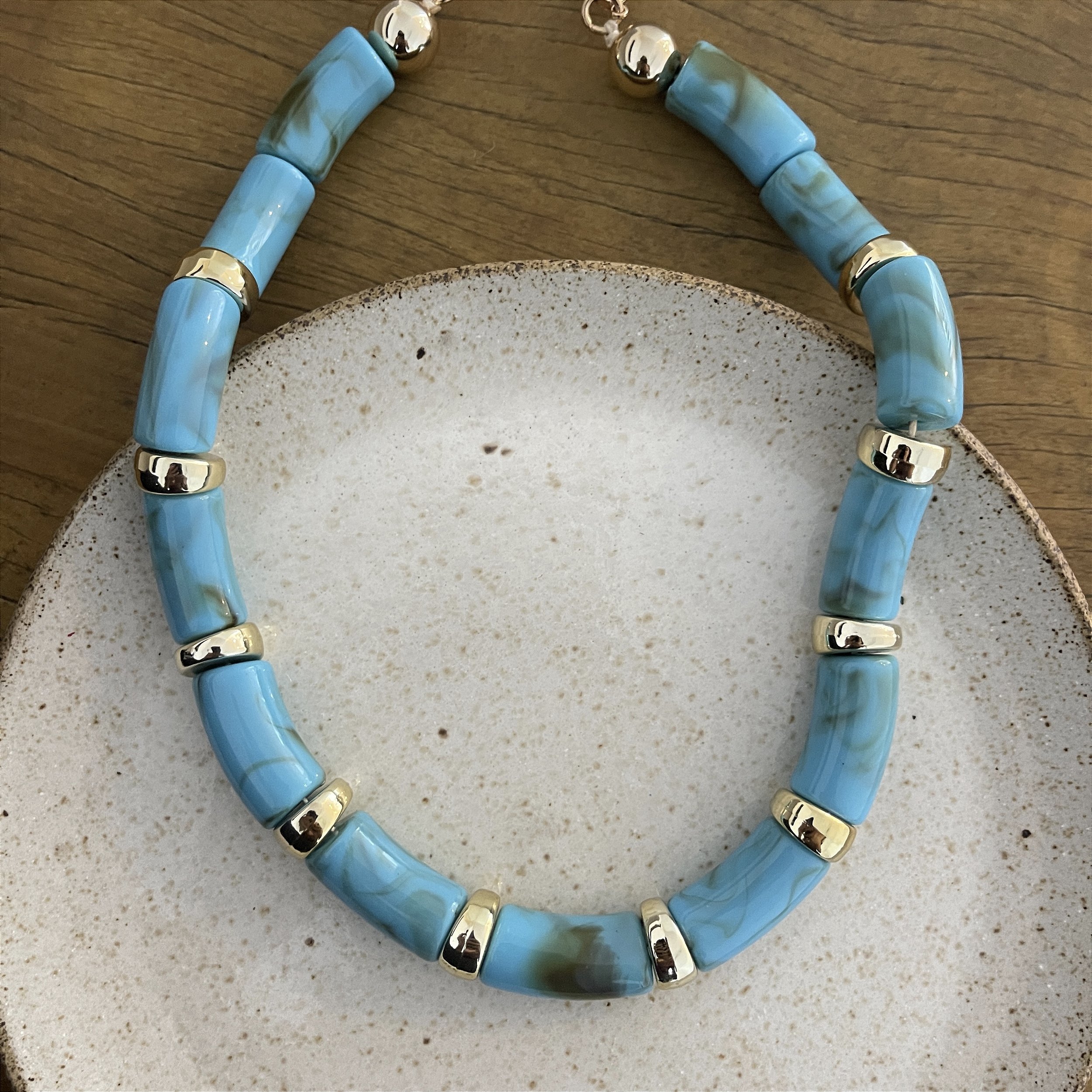 colar com peças de resina que lembra cilindro, e entremeios grossos dourados, cor turquesa mescla, biju