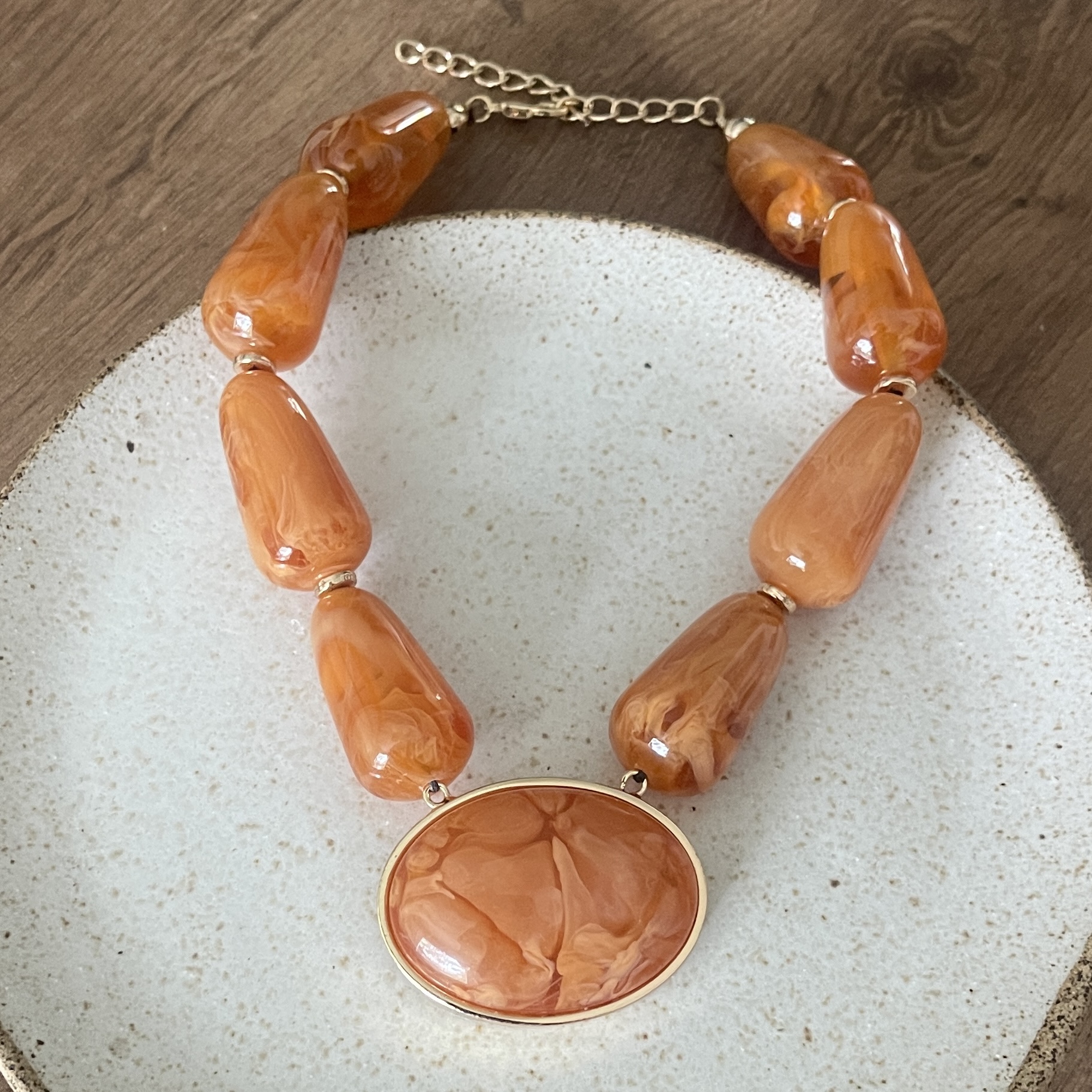 colar com pedras mescla âmbar e uma pedra oval mesclada ambar - biju