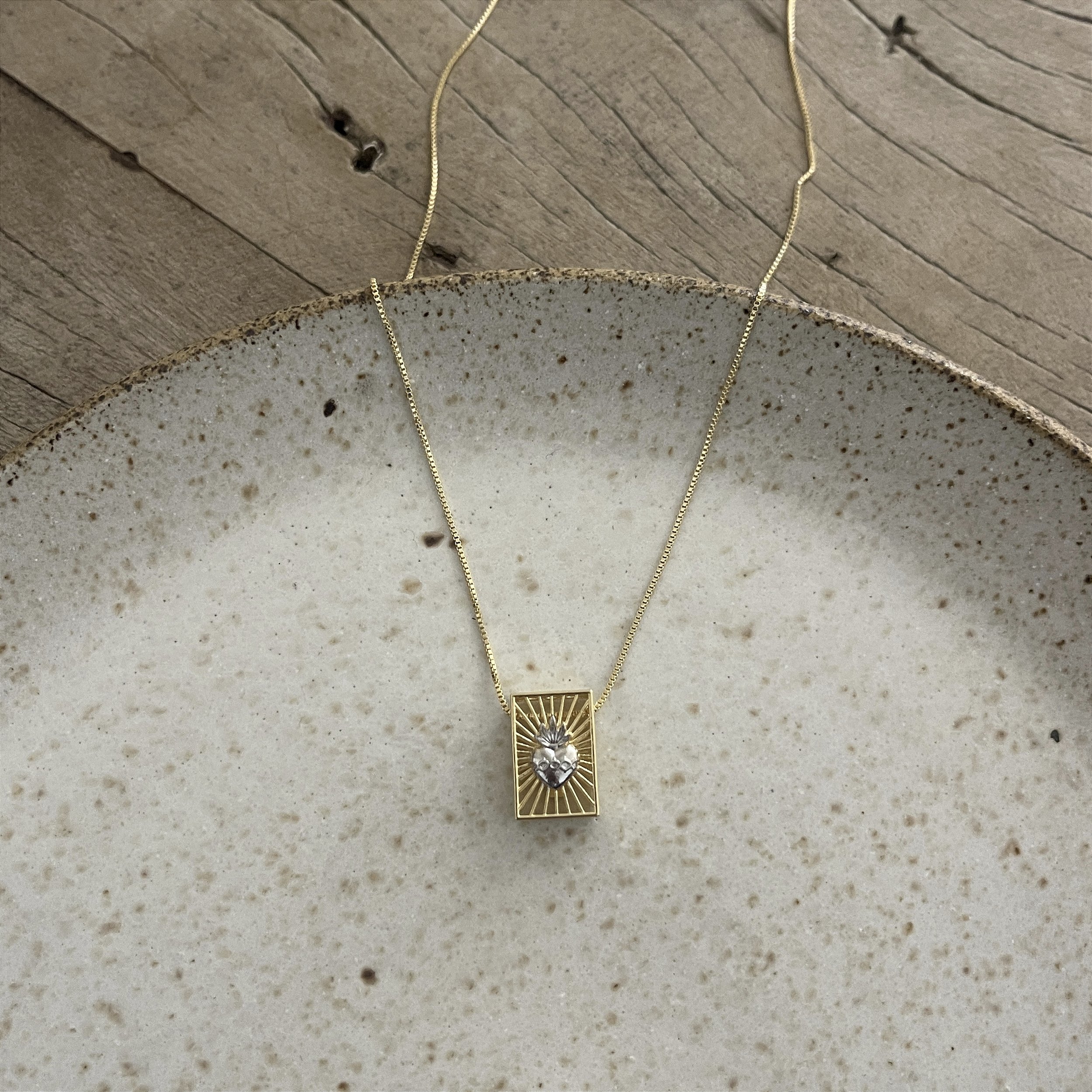 Colar corrente veneziana, com um pingente em caixa retangular com Sagrado Coração em ródio e uma Cruz, Semijóia, Ouro 18k