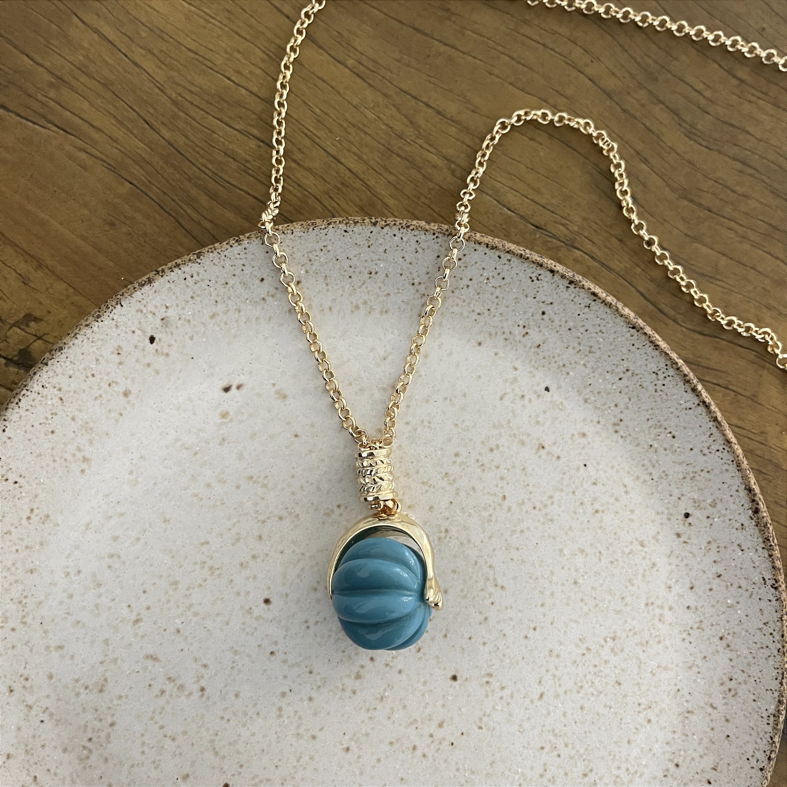colar corrente elos portugueses com um entremeio dourado ajustável, pingente de carambola na cor turquesa c um detalhe de peixe, bijuteria