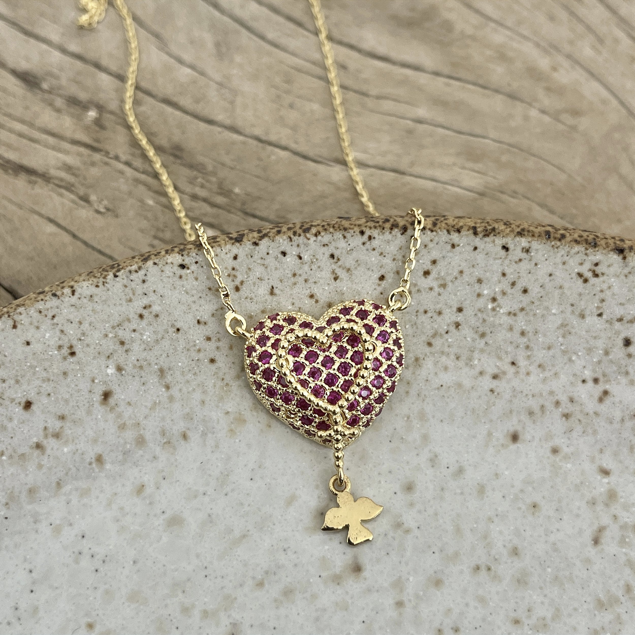Colar coração Rubi Rendado com cruz e espírito santo, dourado - semi joia