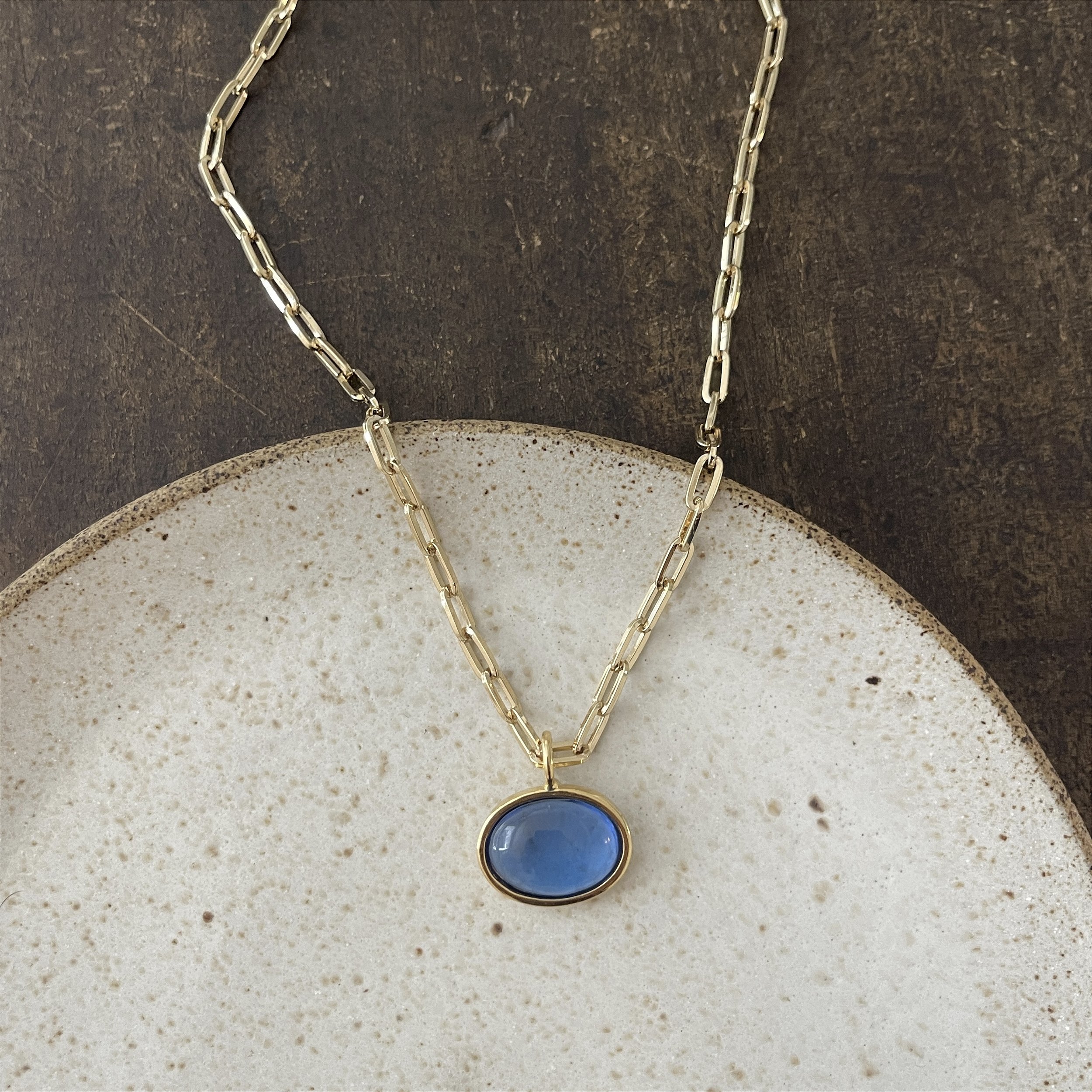 Colar de corrente retangular dourado com pingente de pedra azul oval , curto , bijuteria.