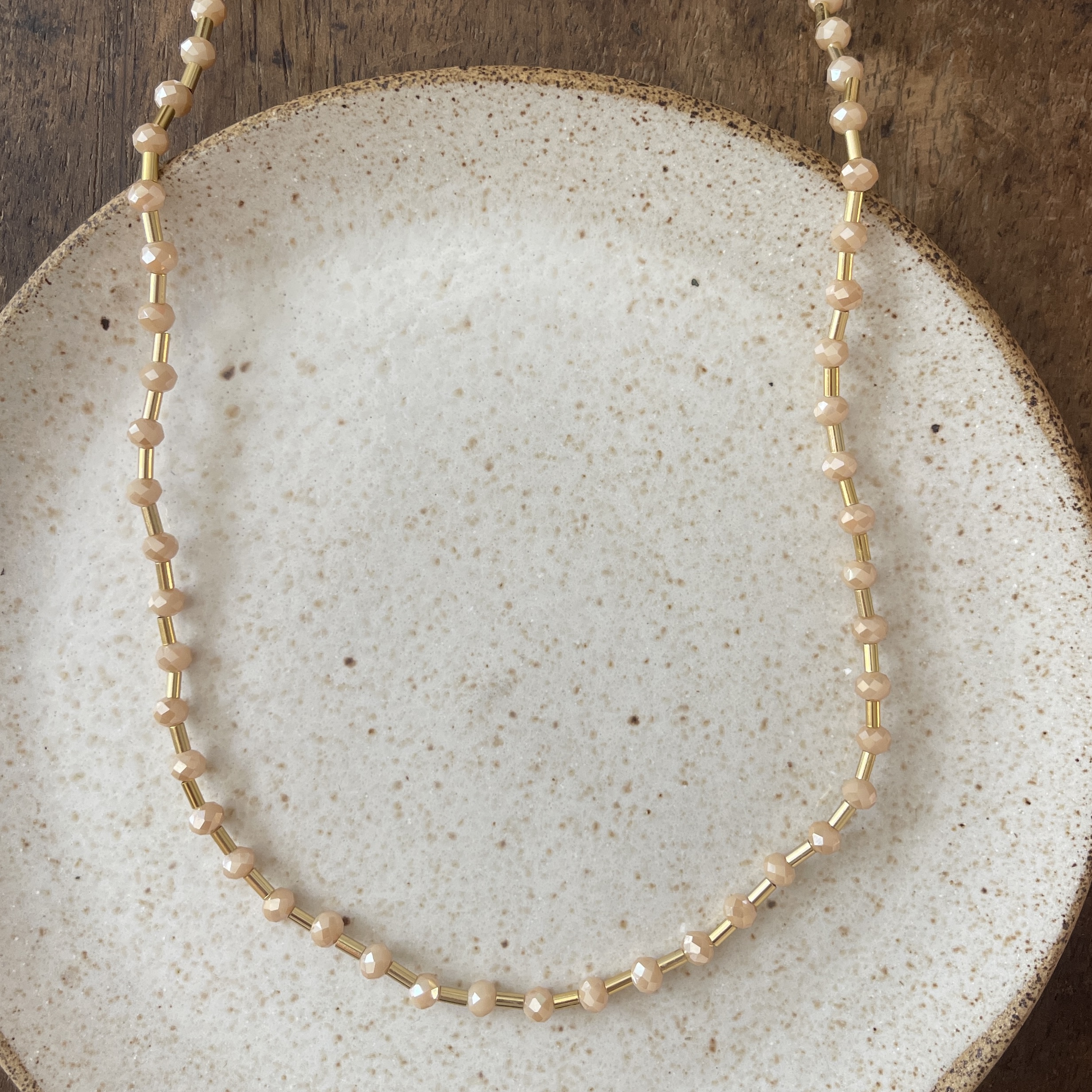 Colar de cristais nude, entremeios de canutilhos dourados, Longo, bijuteria.