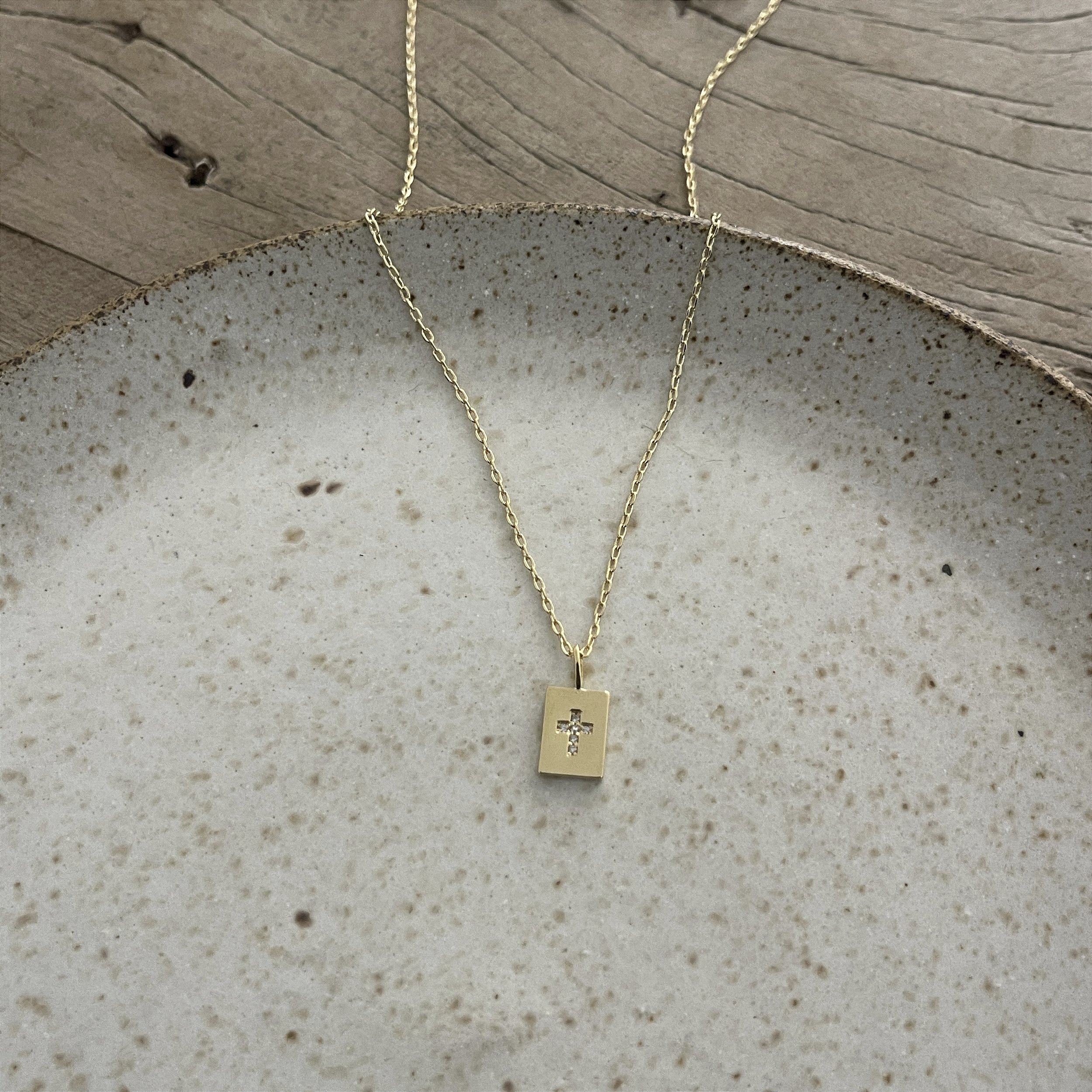 Colar corrente elos portugueses, com pingente retangular com uma Cruz cravejada de Zircônias, Semijóia, Ouro 18k