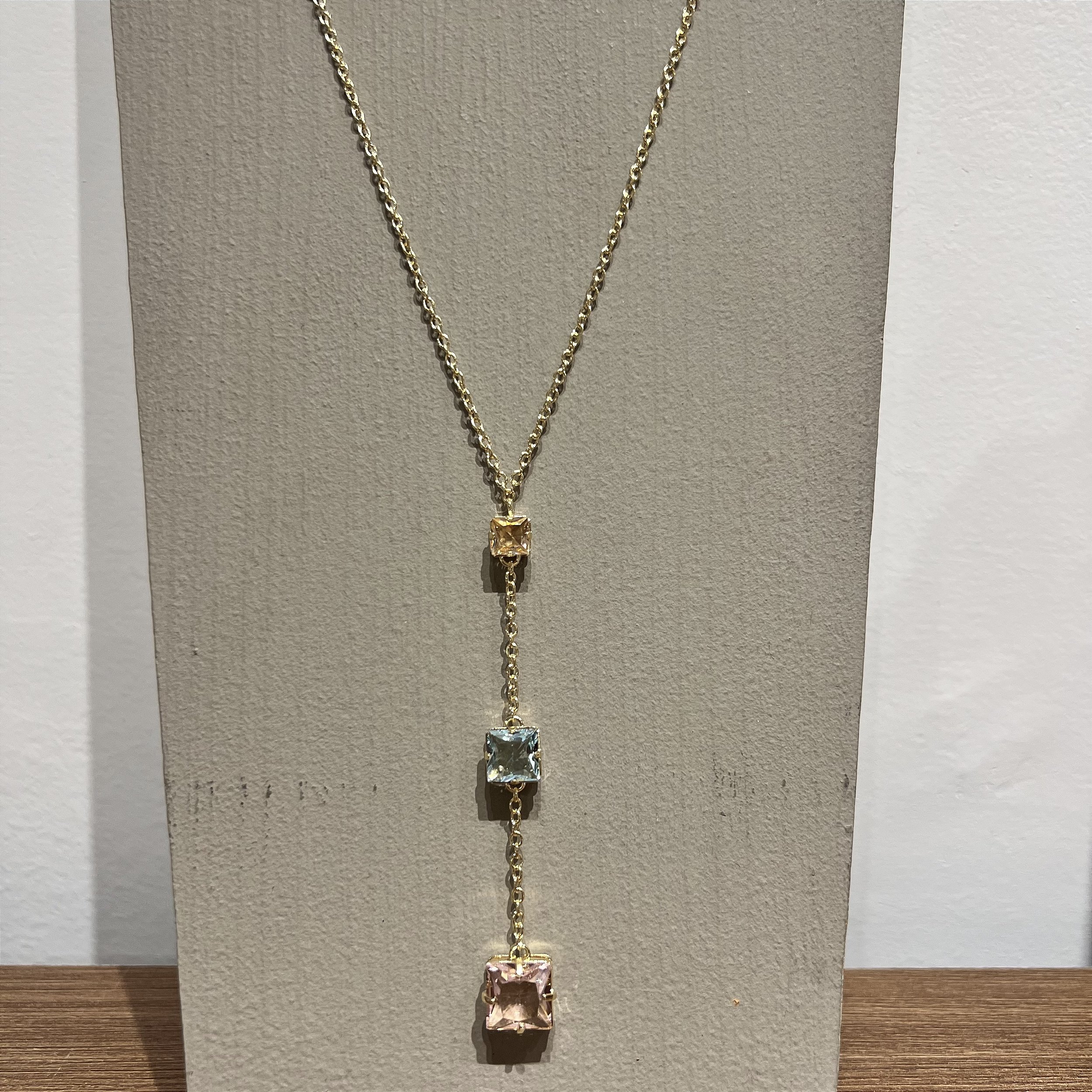 colar gravata pedrsas nas cores áqua, kunzinta e morganita, dourado - semijoia