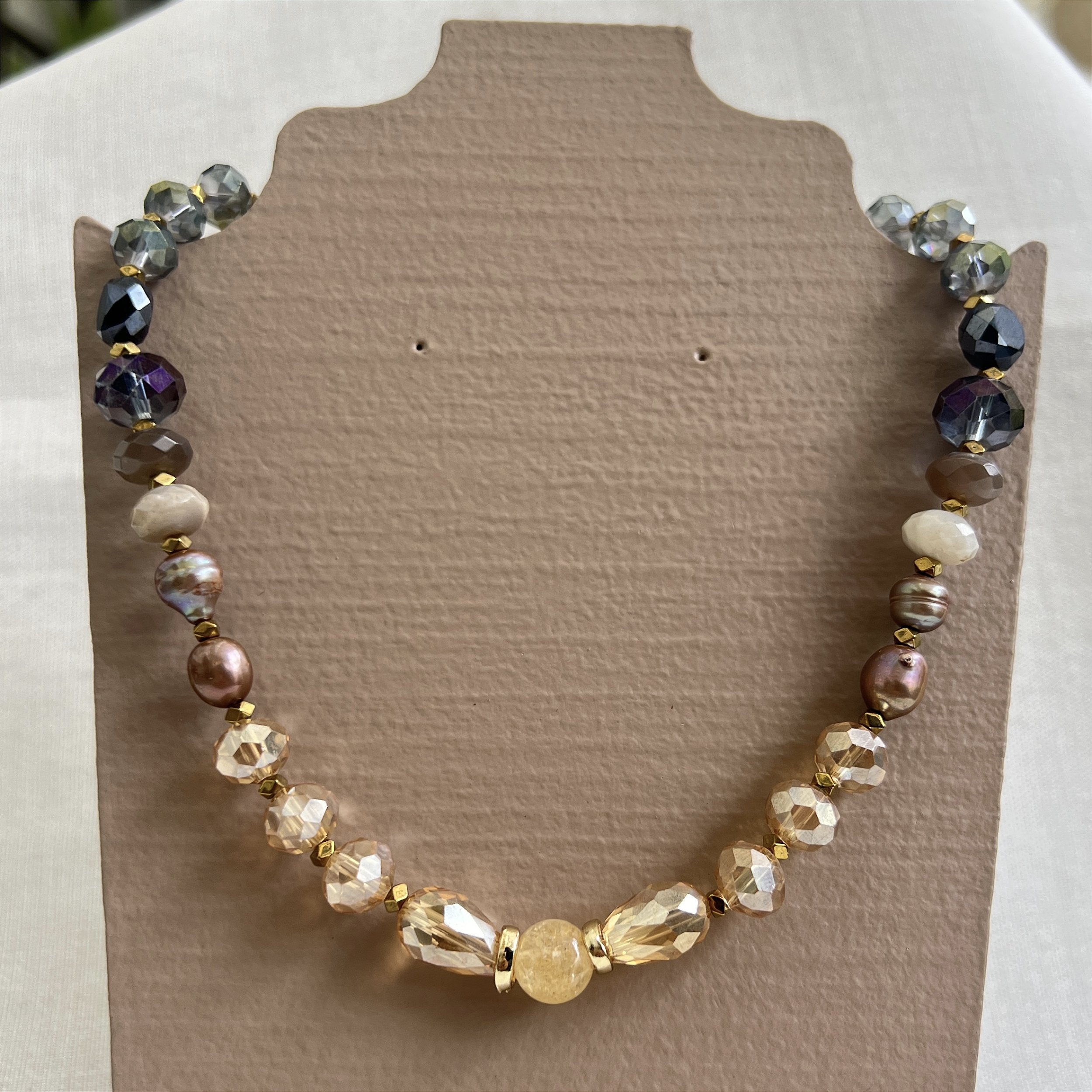 Colar com Cristais coloridos cores bege e fumê de várias formas e tamanhos - bijuteria.