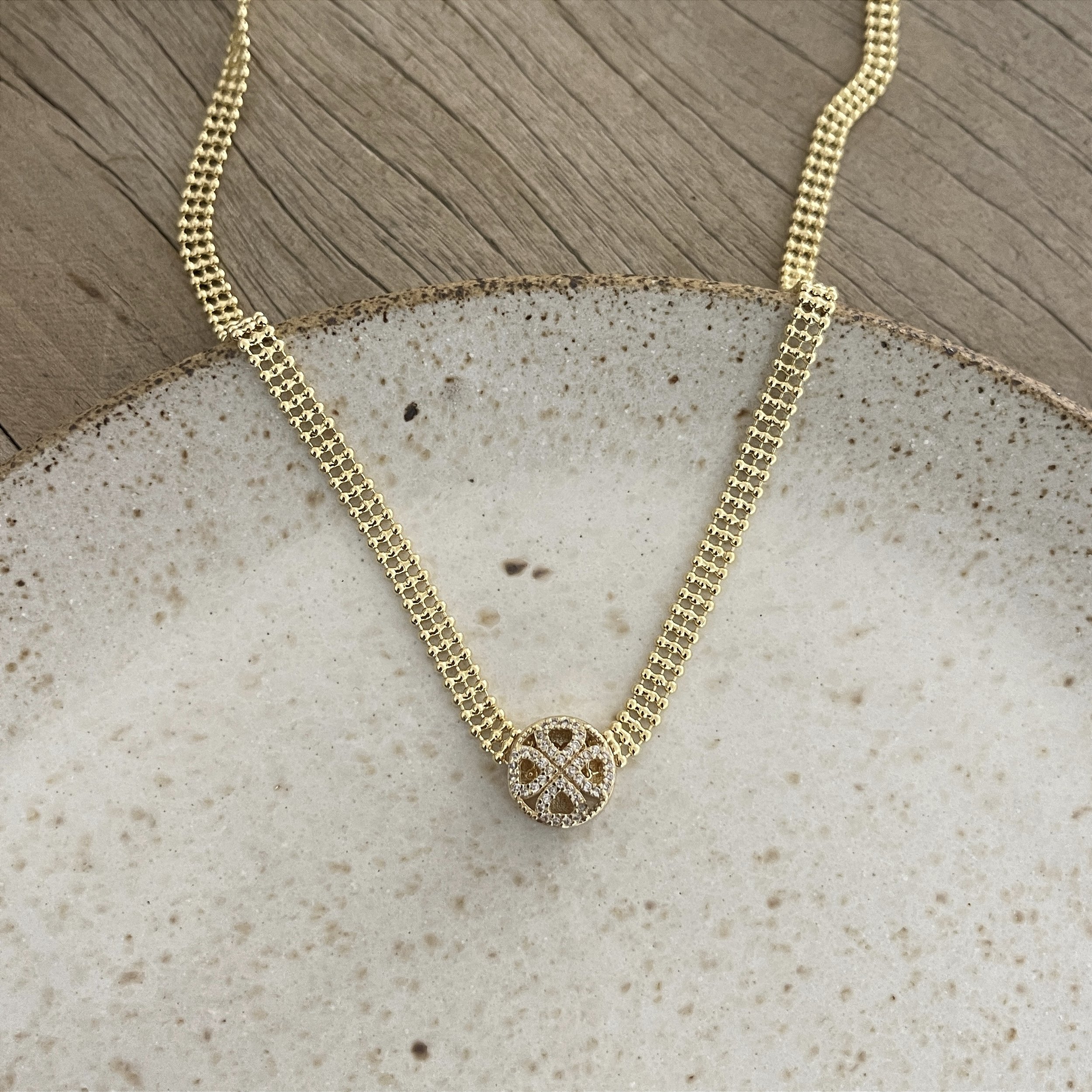 colar corrente de esferas trio, com pingente de zircônia, dourado - semijoia