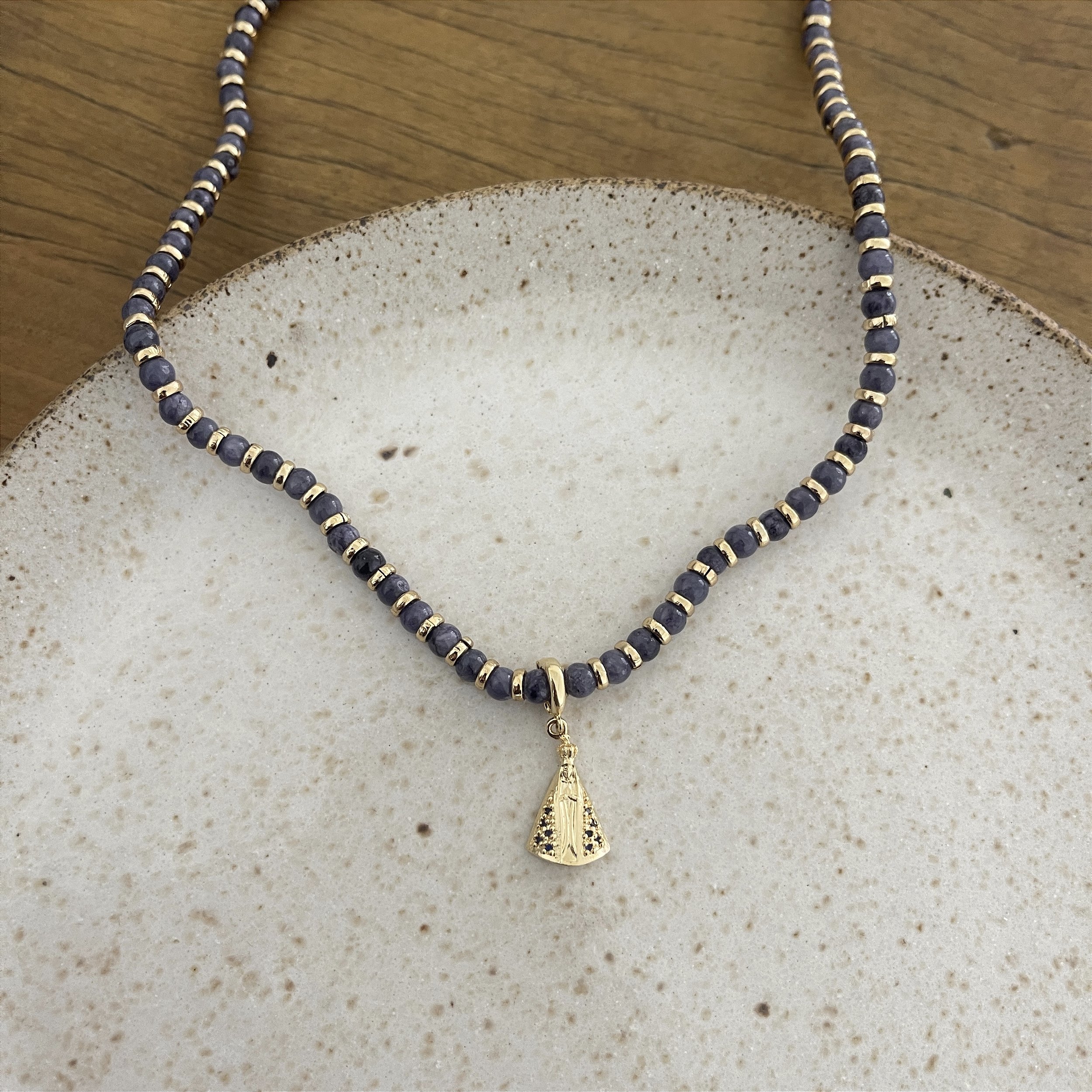 Colar de pedras no tom azul jeans com detalhes em dourado e pingente de Nossa Senhora Aparecida com Zircônias Azuis e mini esferinhas dourado, bijuteria