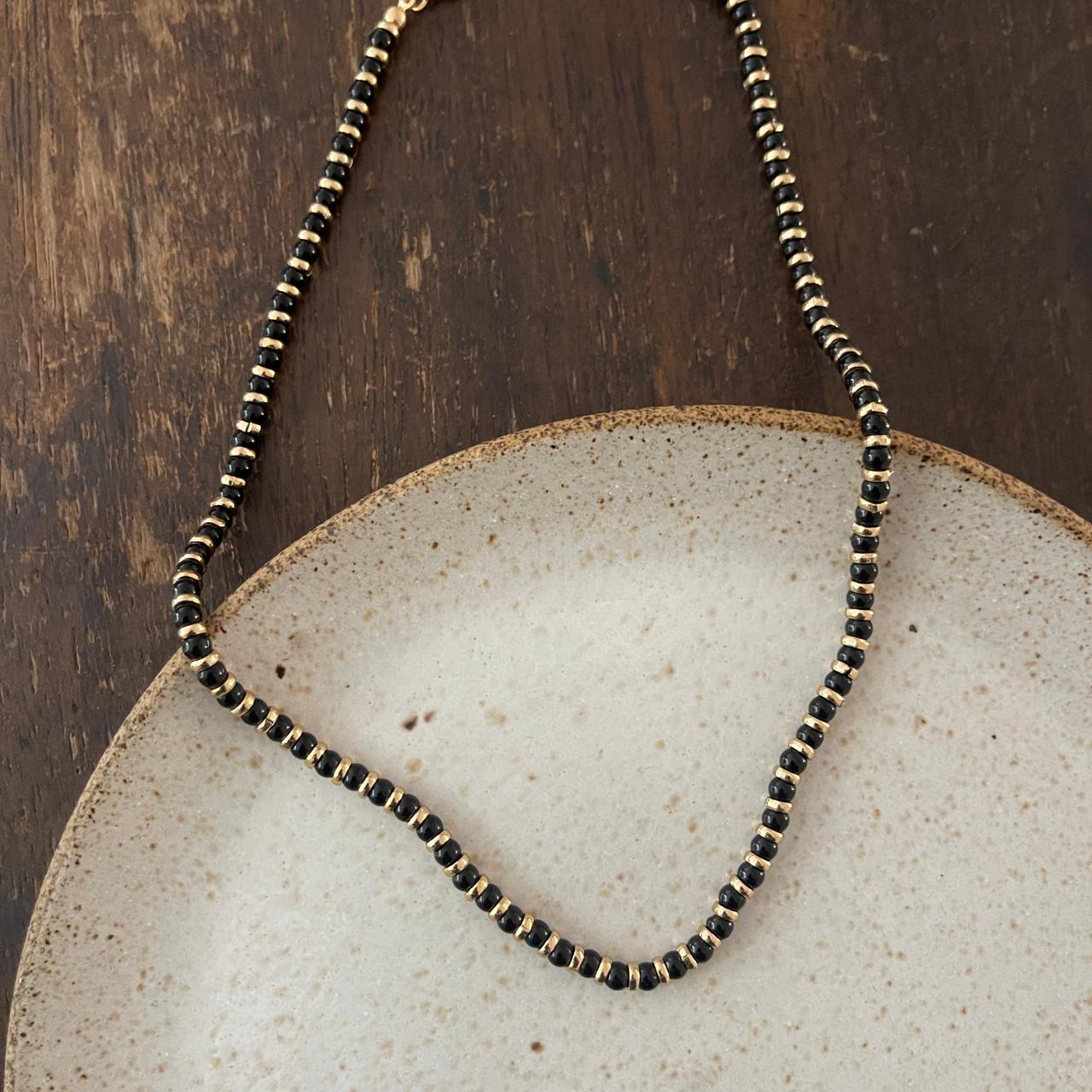 Colar de pedras naturais com um entremeio dourado entre cada pedra, bijuteria