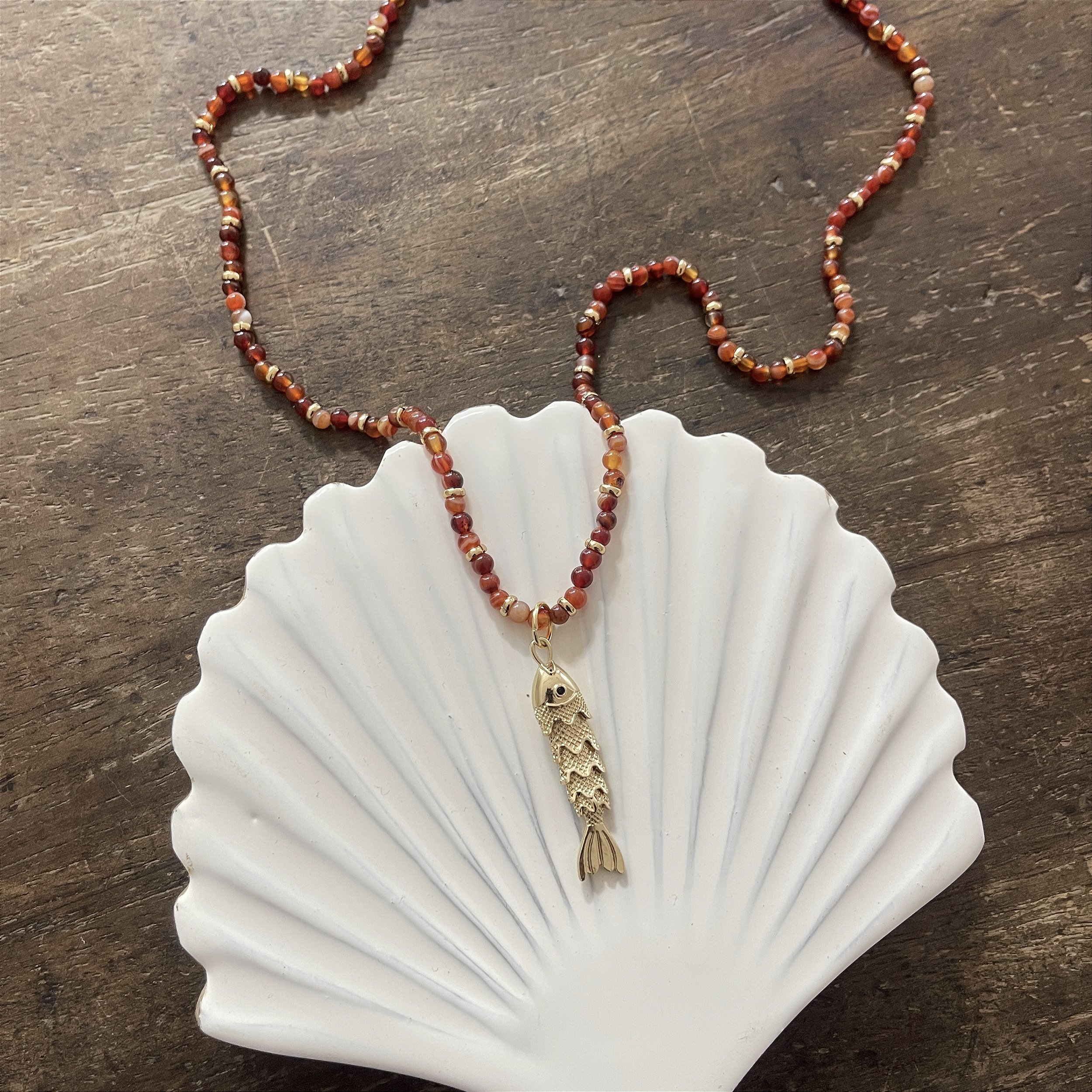 colar murano laranja com entremeios dourado e pingente de peixe dourado - semijoia