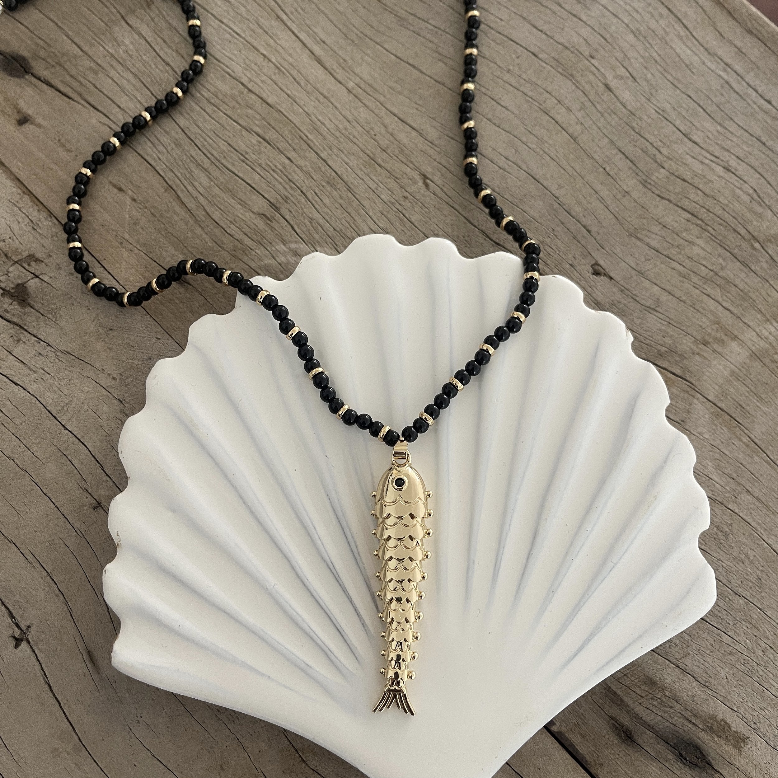 colar murano preto com entremeios dourado e pingente de peixe dourado - semijoia