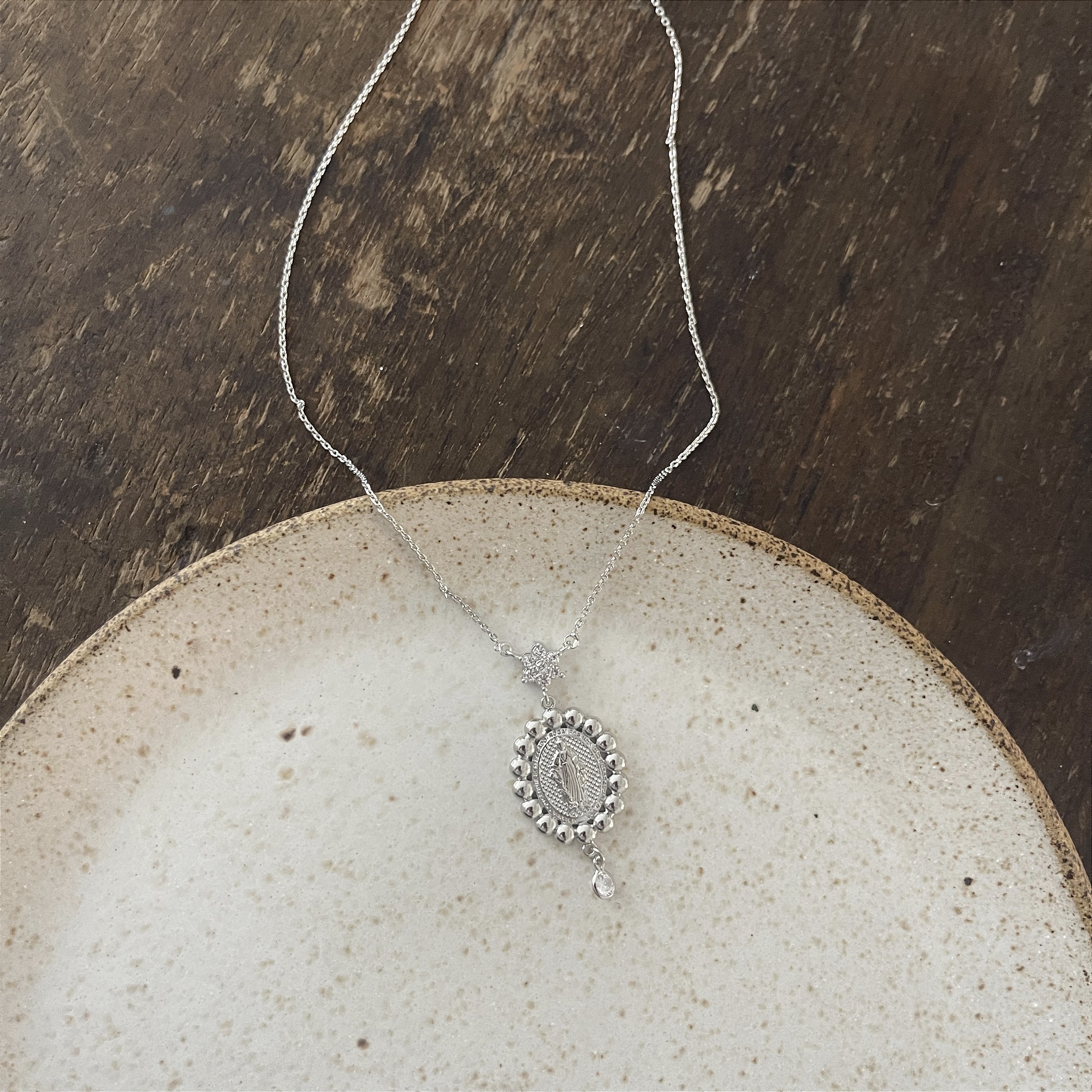 colar corrente dourada, um pingente com flor de zircônia, imagem de nossa senhora das graças e esferas com uma mini zircônia redonda - semijoia, Ródio