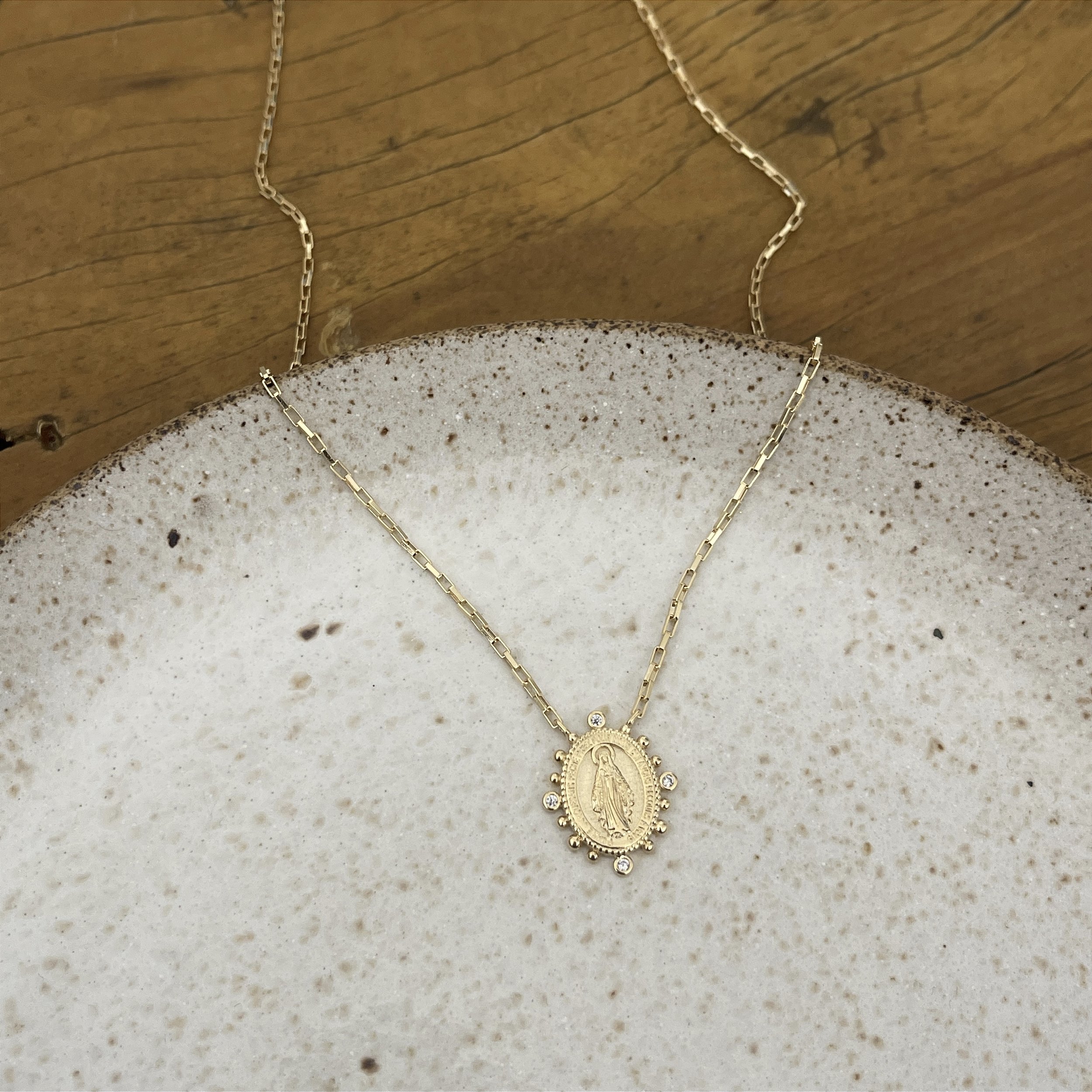 colar corrente cartier mini quadrada com medalha de nossa senhora das graças (esferas e zircônias por fora), Semijoia, Ouro 18k