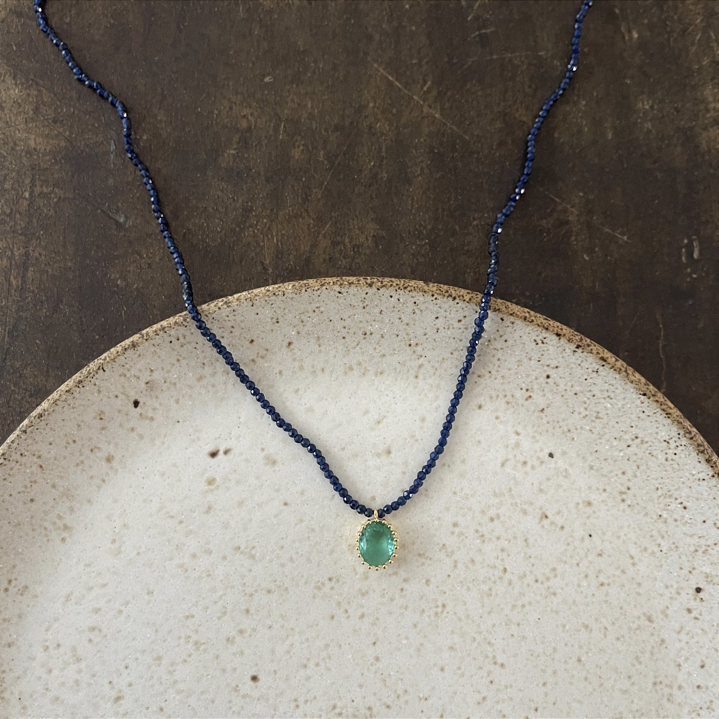 colar de mini cristais azuis com pingente de zircônia na cor verde, cravado com mini esferinhas por fora, dourado - semijoia