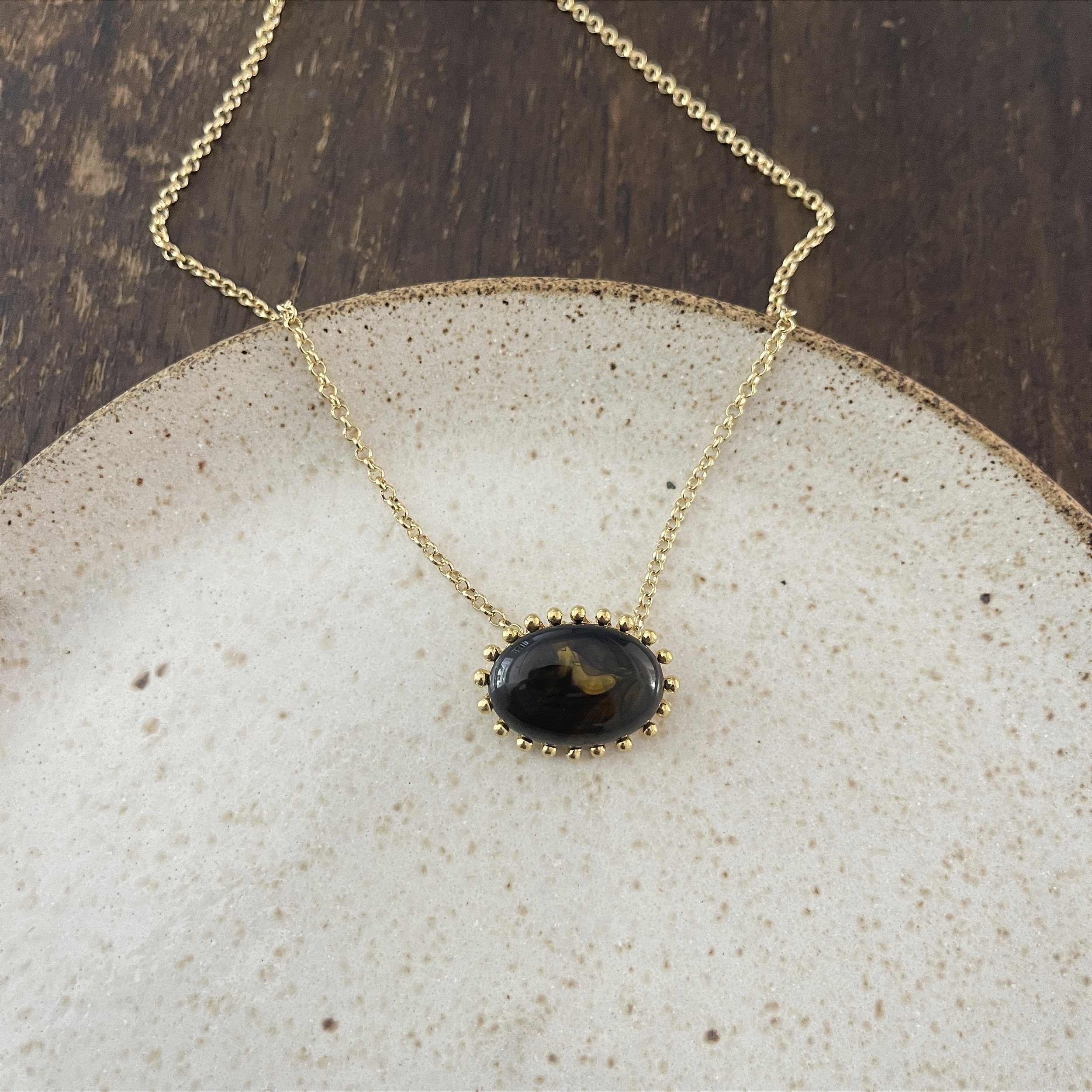Colar com uma pedra de resina oval e detalhes em esferas - Dourado - semijoia