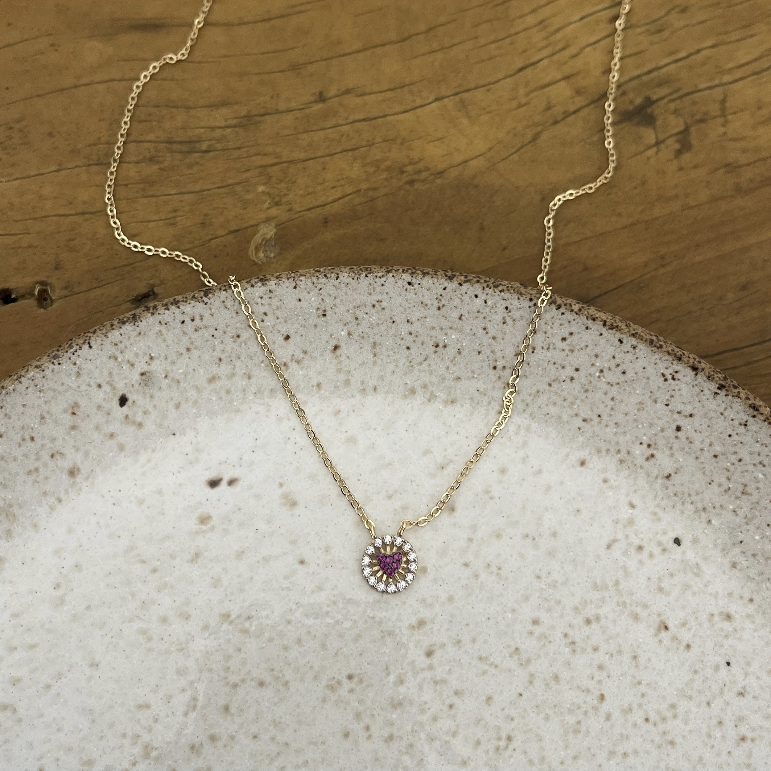 colar redondo com coração rubi e Cravejado de Zircônia, Semijoia, Ouro 18k