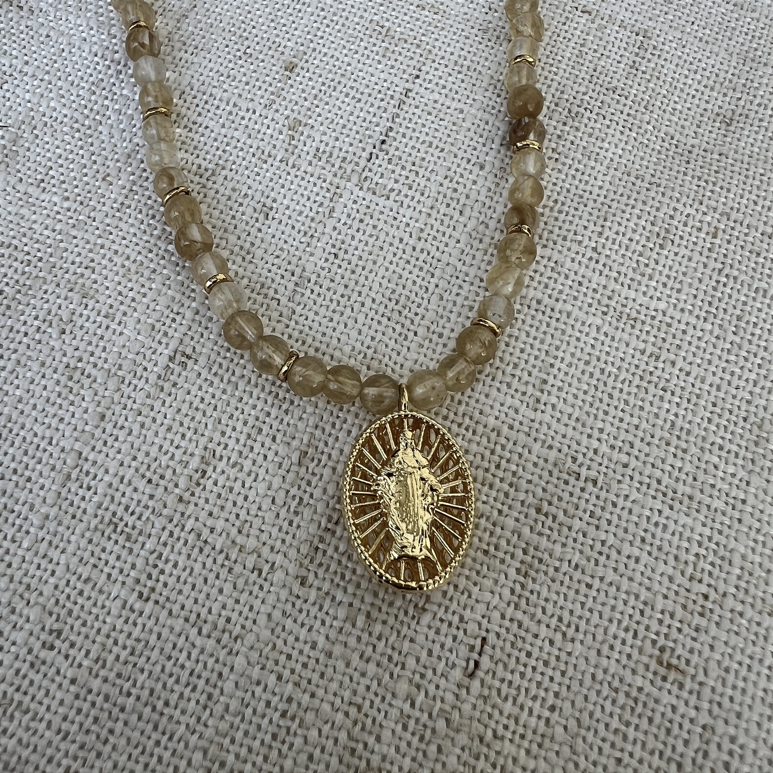 Colar de pedras de pedras rutilado com detalhes em dourado e pingente de Nossa Senhora das Graças, dourado, bijuteria