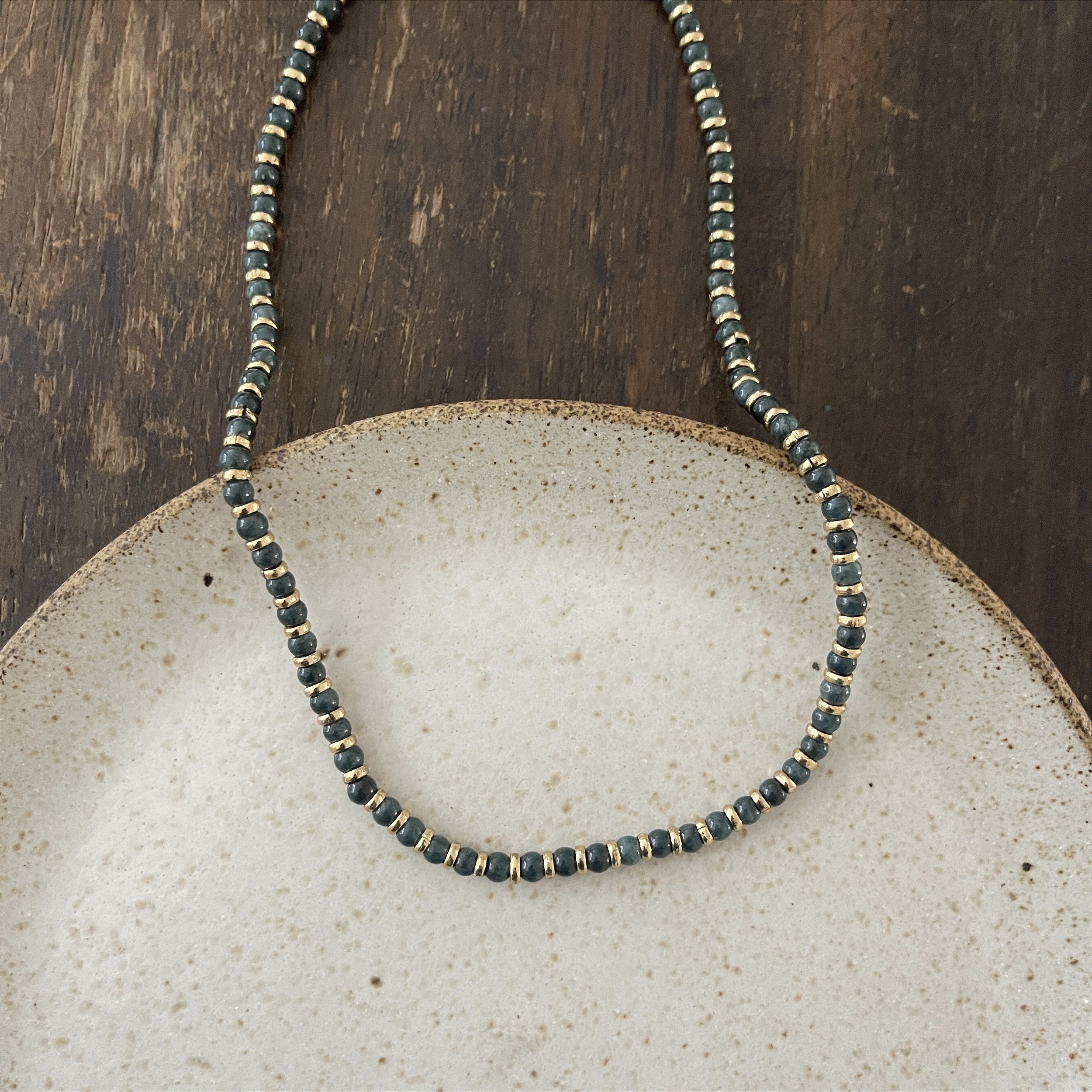 Colar de pedras naturais com um entremeio dourado entre cada pedra, bijuteria