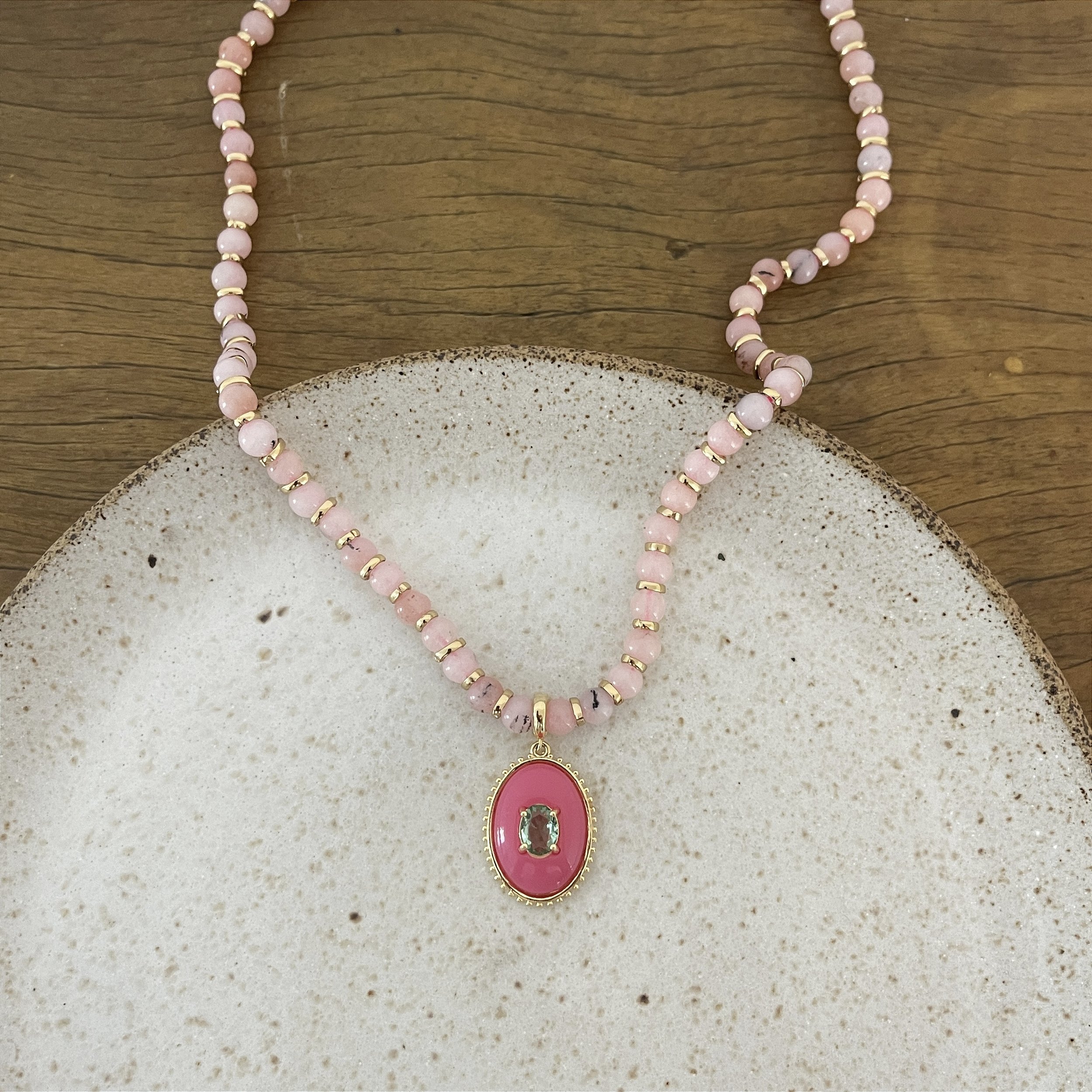 Colar de pedras Naturais com pingente rosa pink e uma pedra verde