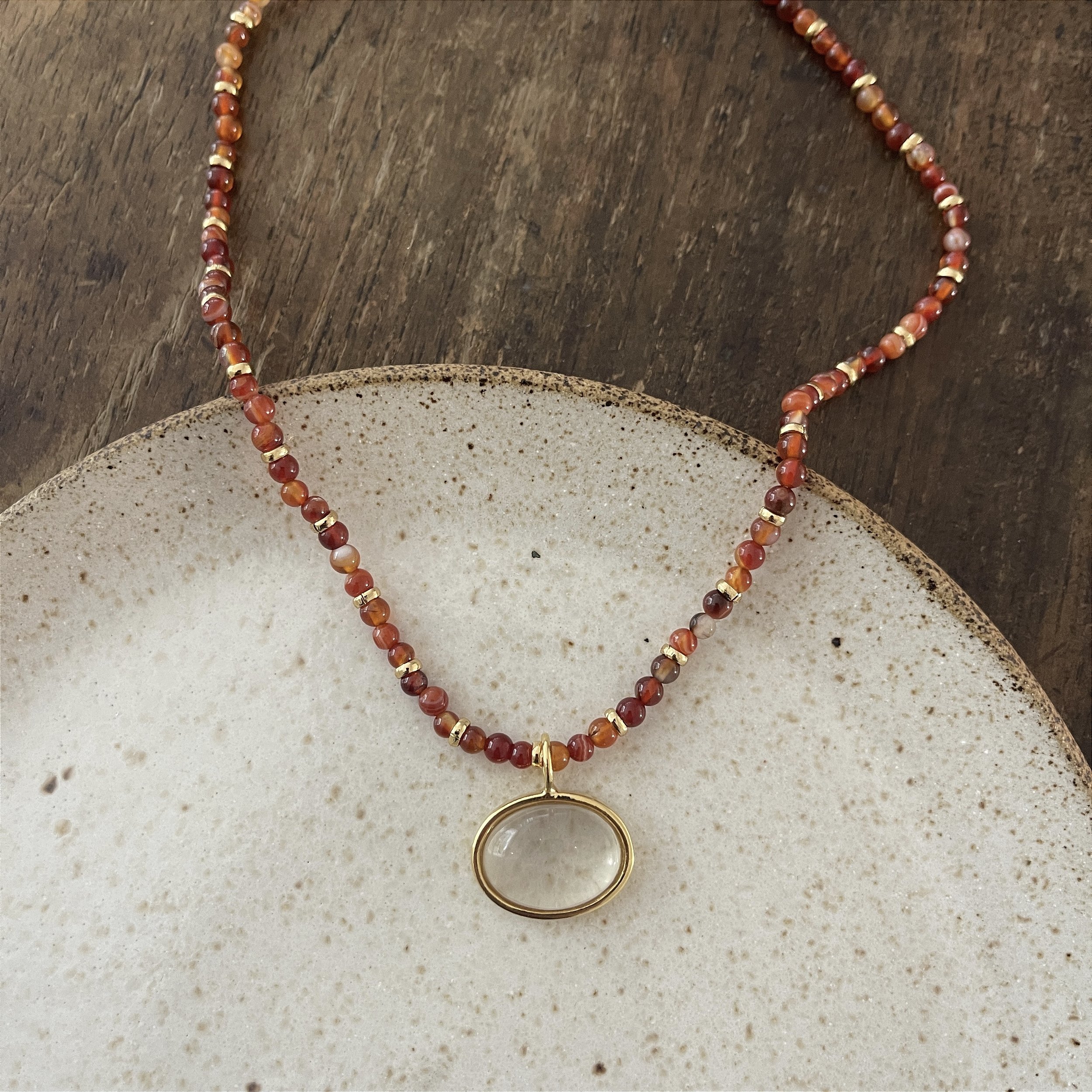 Colar de pedras naturais laranja semitrasparente com pingente de pedra transparente oval , curto , bijuteria.