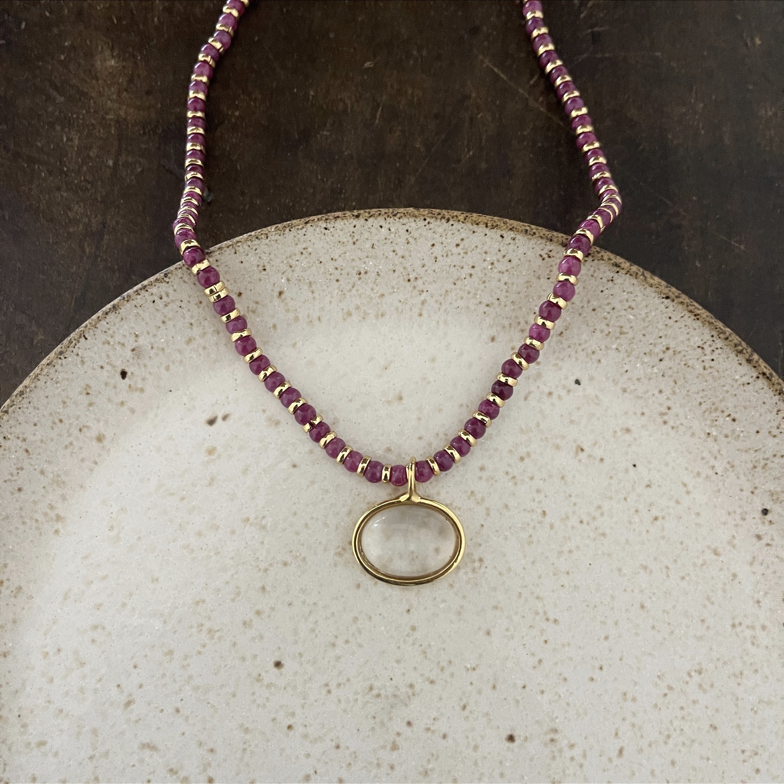 Colar de pedras naturais lilás degradê com pingente de pedra transparente oval , curto , bijuteria.