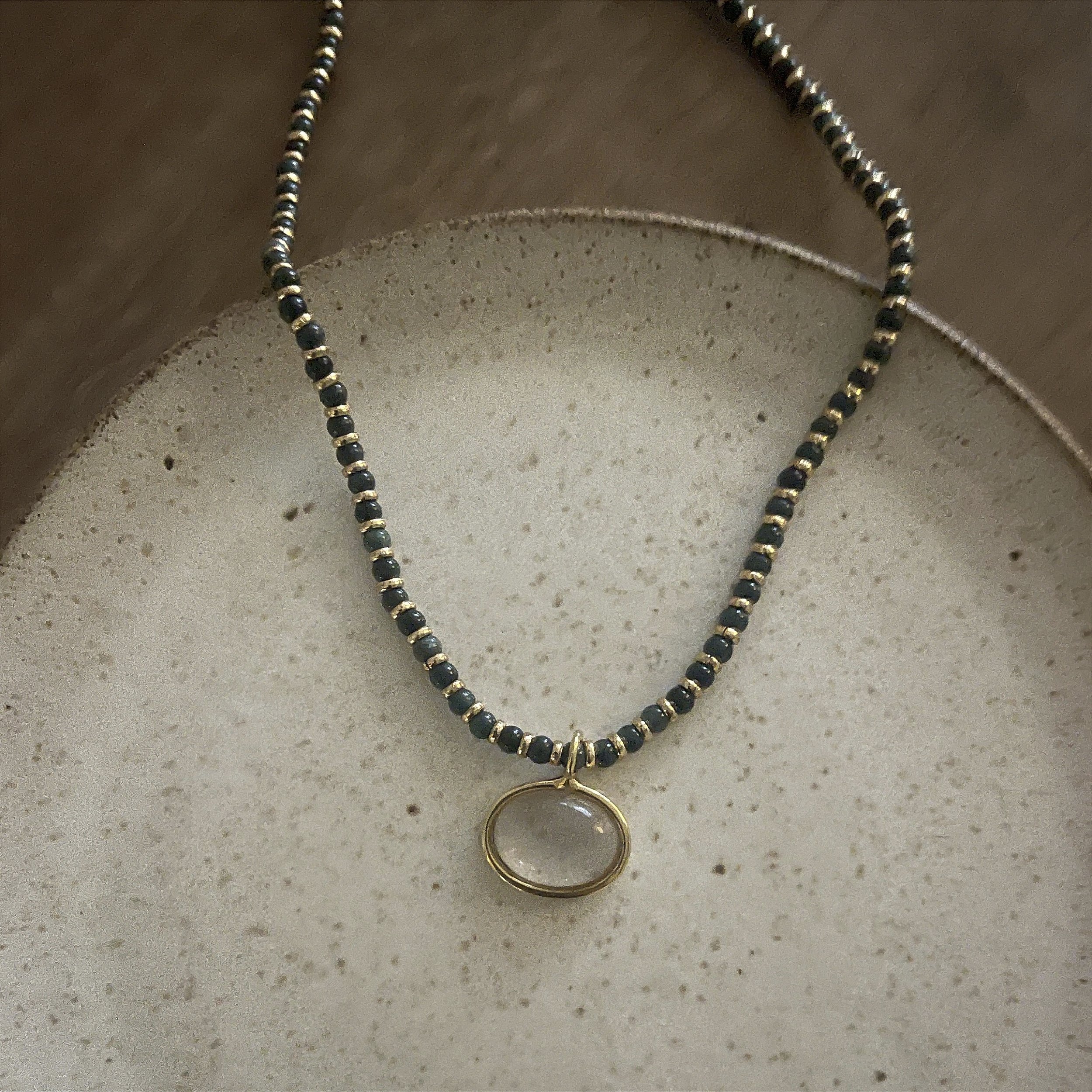 Colar de pedras naturais verde degradê com pingente de pedra transparente oval , curto , bijuteria.