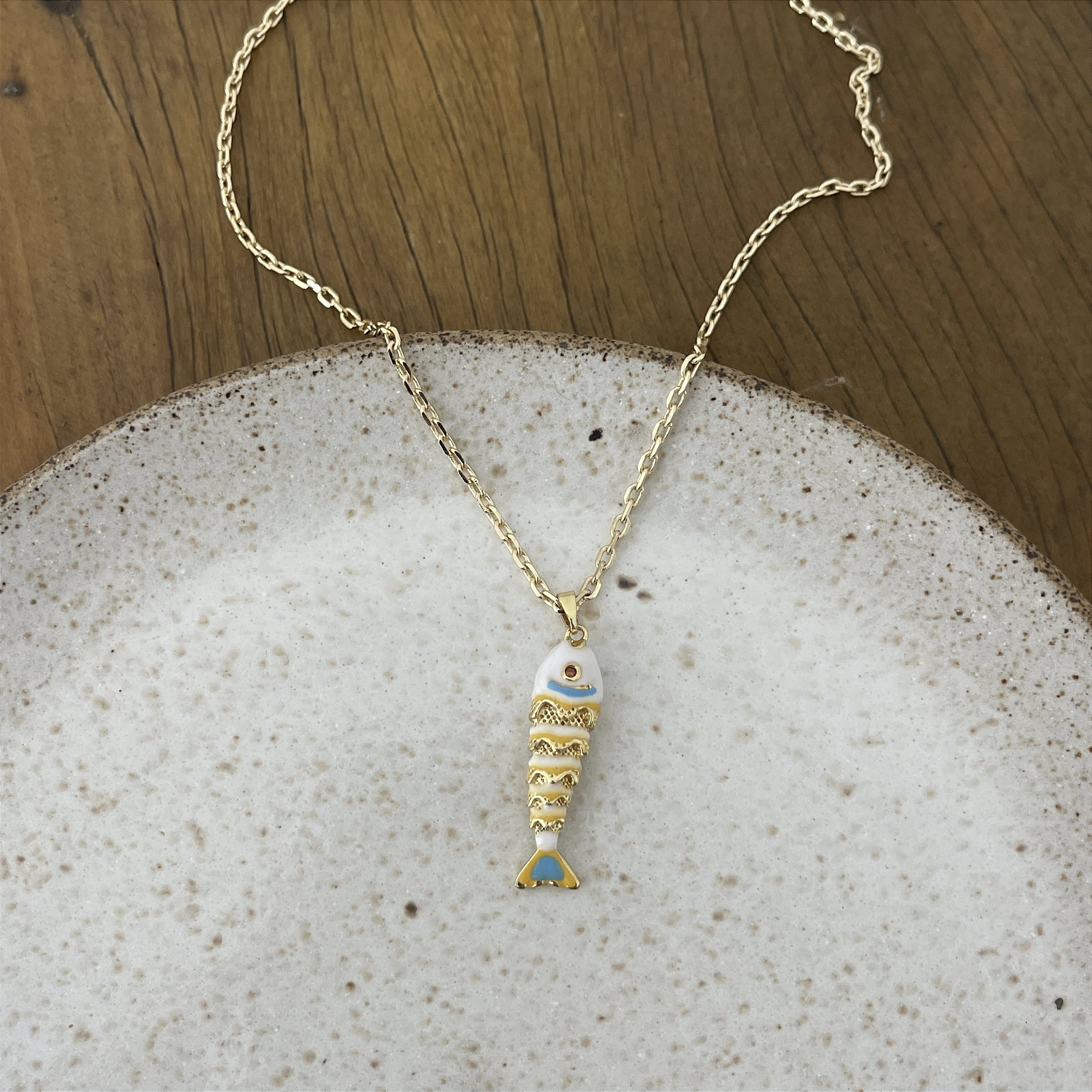 Colar corrente elos com pingente de peixe dourado com azul