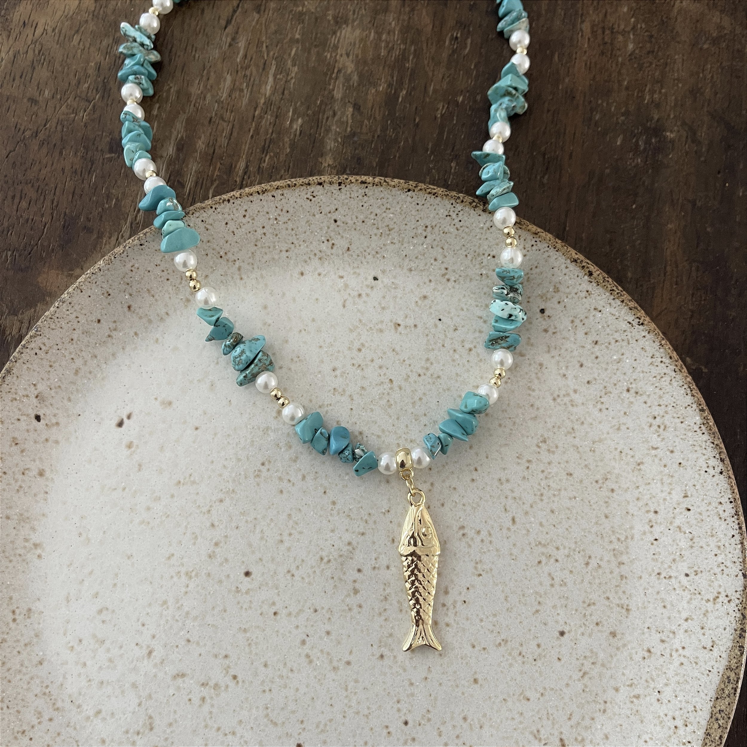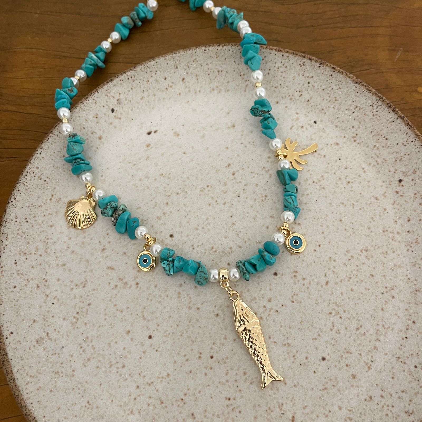 colar de pedras turquesa, pérolas, com penduricalhos do mar, biju