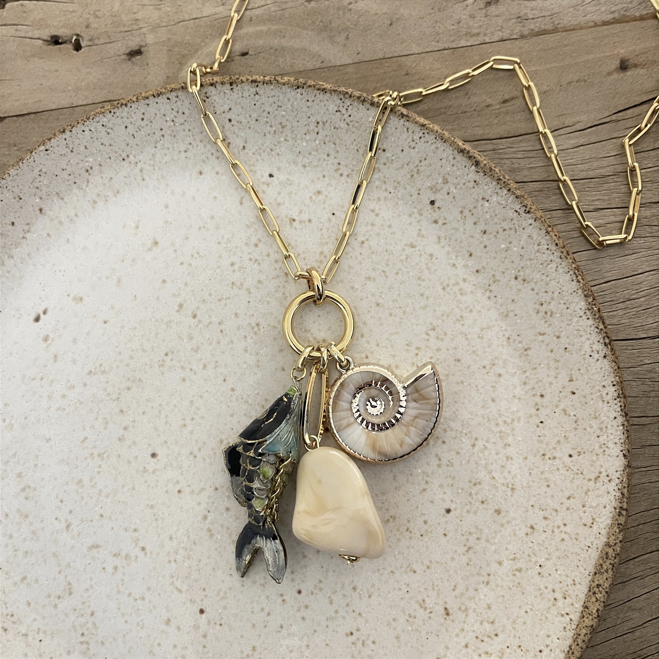 colar longo com pingentes de peixe, caracol e pedra - bijuteria