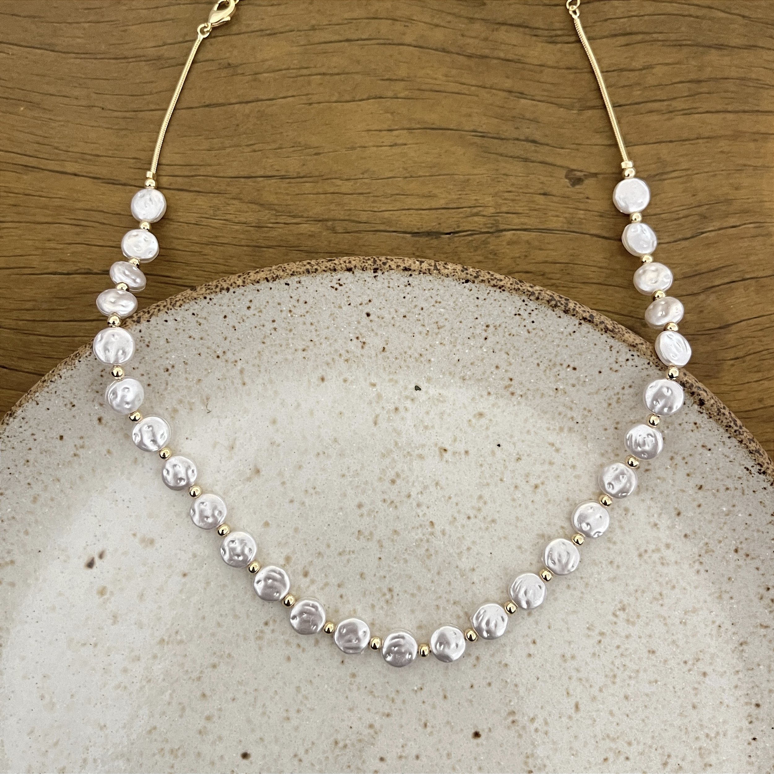 colar de pérolas achatadas com entremeios de esferas, corrente rabo de rato no final, dourado - semijoia, ouro 18k