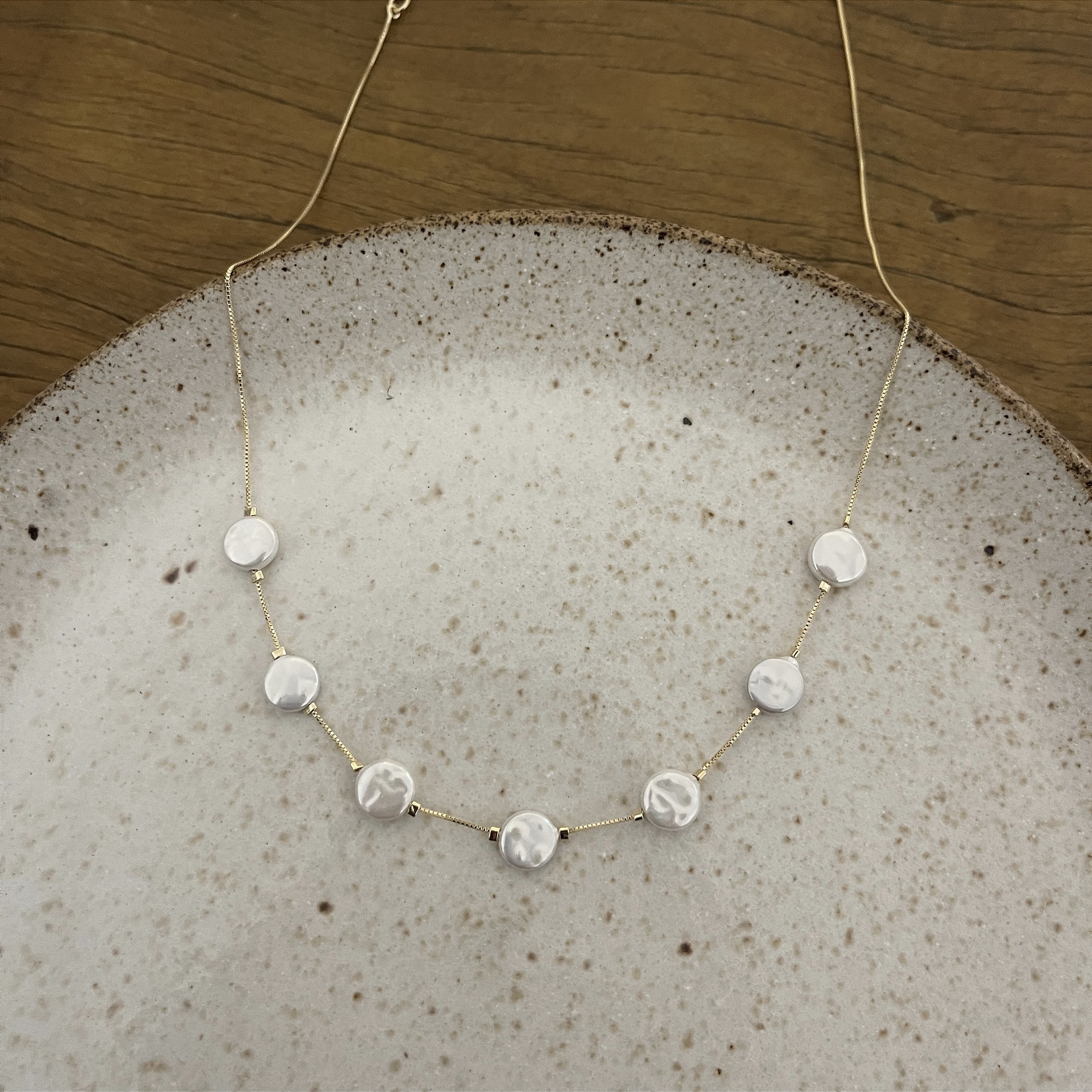 colar de pérolas achatadas com entremeios dourados, corrente veneziana - semijoia, ouro 18k