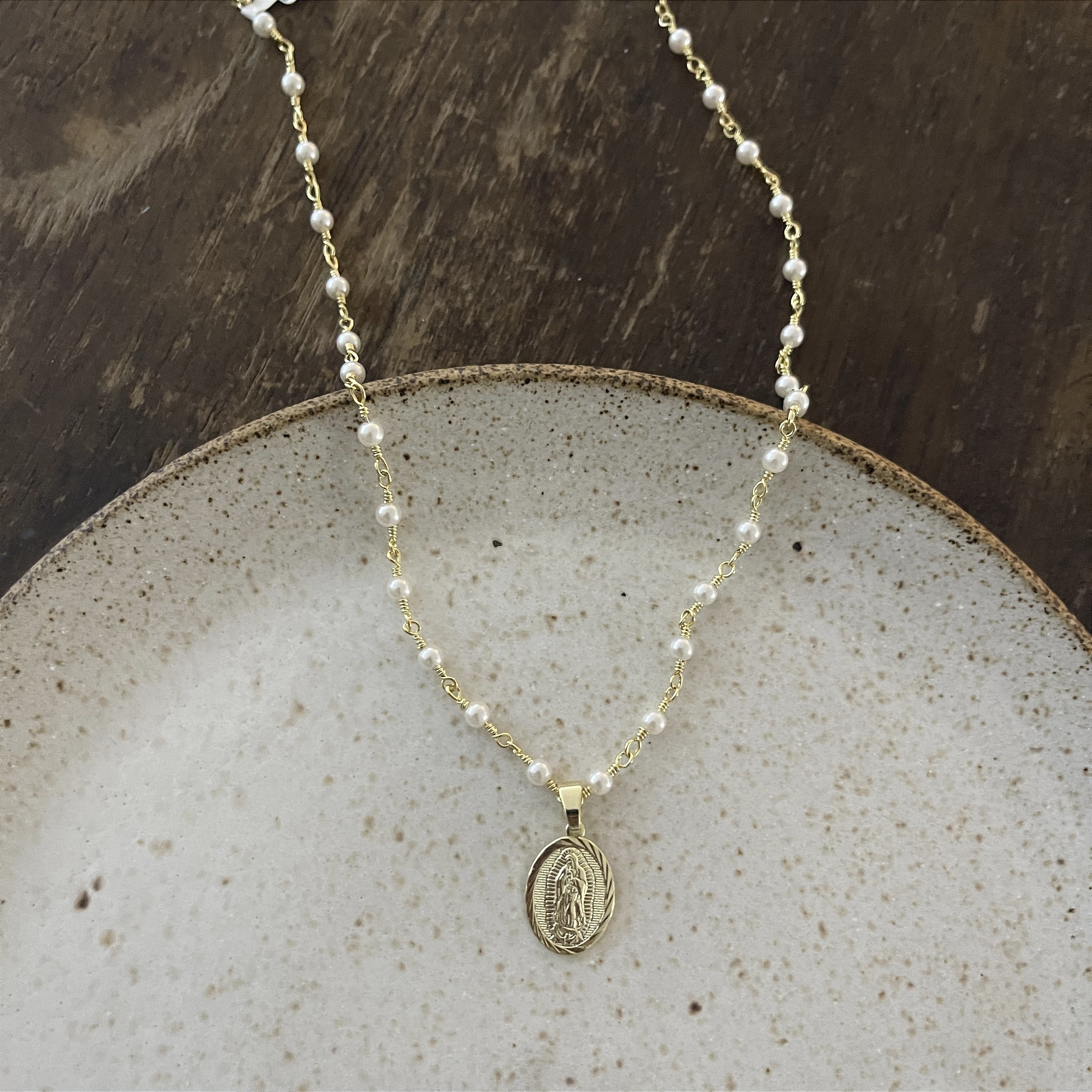 colar de pérola com uma medalha nossa senhora de guadalupe dourado - semijoia