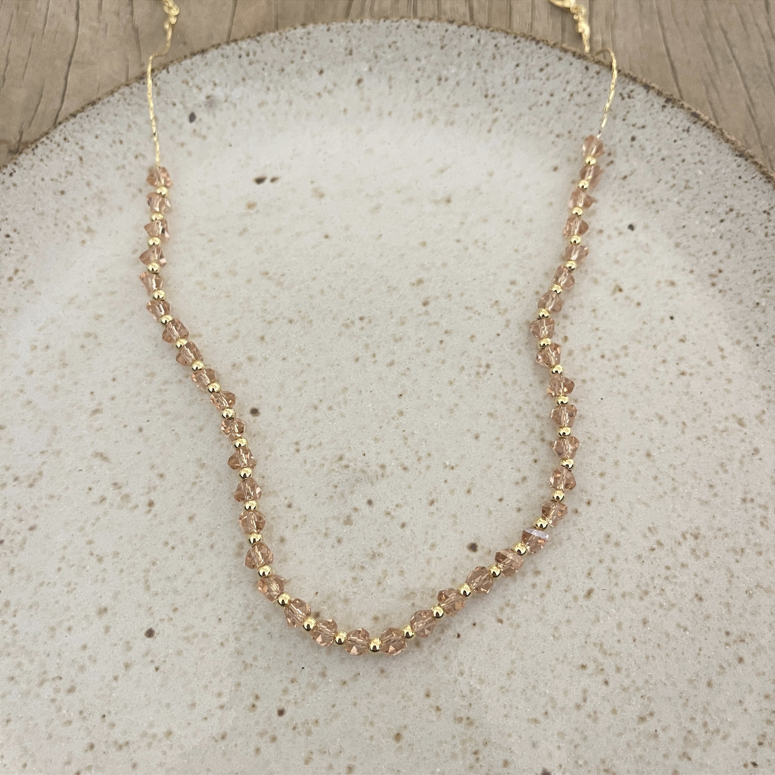 colar losangolo de cristais rosê com esferas douradas - semijoia