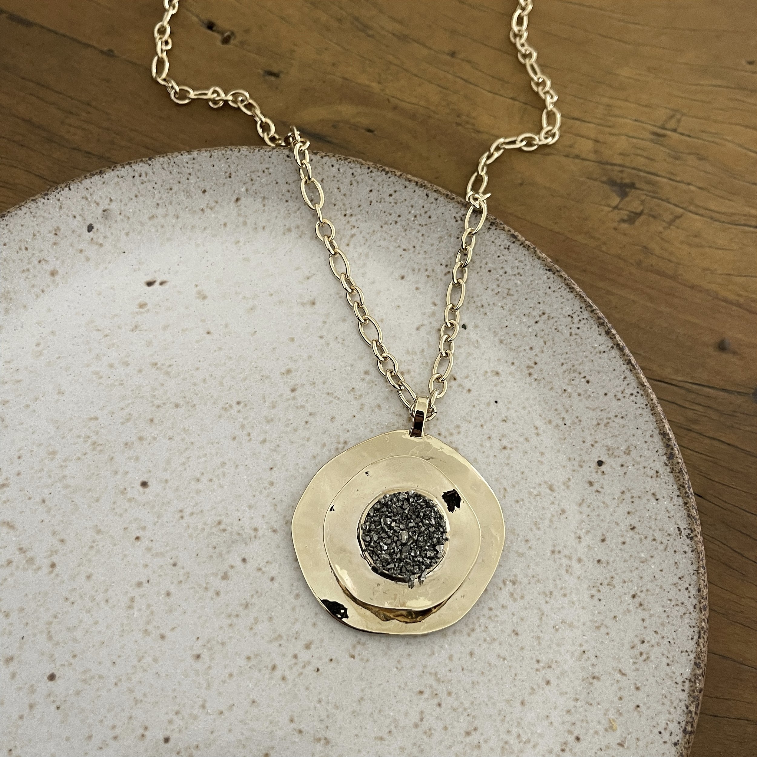 colar elos ovais, pingente duas placas redondas com pedrinhas de pirita, dourado - semijoia