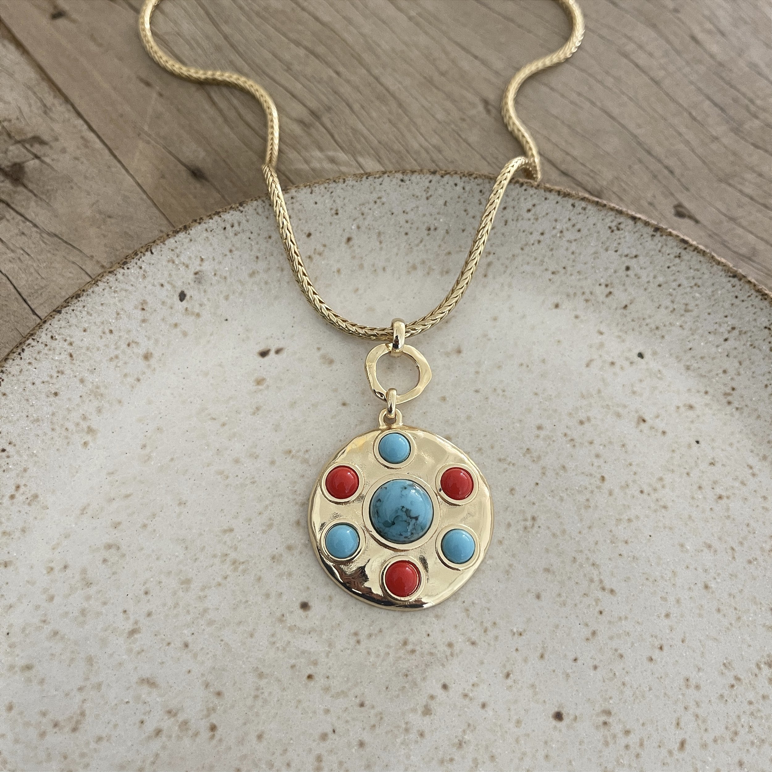 colar rabo de rato dourado e pingente medalha com pedras vermelhas e turquesas - semijoia